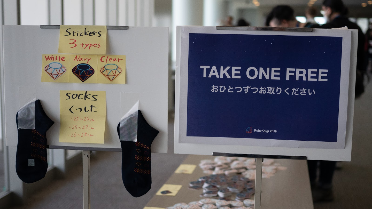 2Fのエントランスでは、RubyKaigi公式のノベルティを配布。