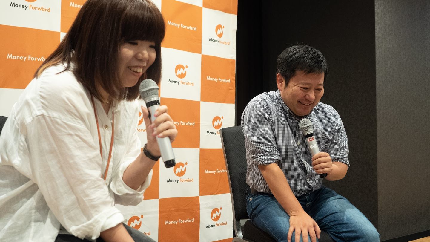 まずは、代表の辻と、社員数30名のころに入社した社長室デザイン戦略グループの金井の二人で、マネーフォワードのCultureの歴史を振り返るパネルディスカッション。