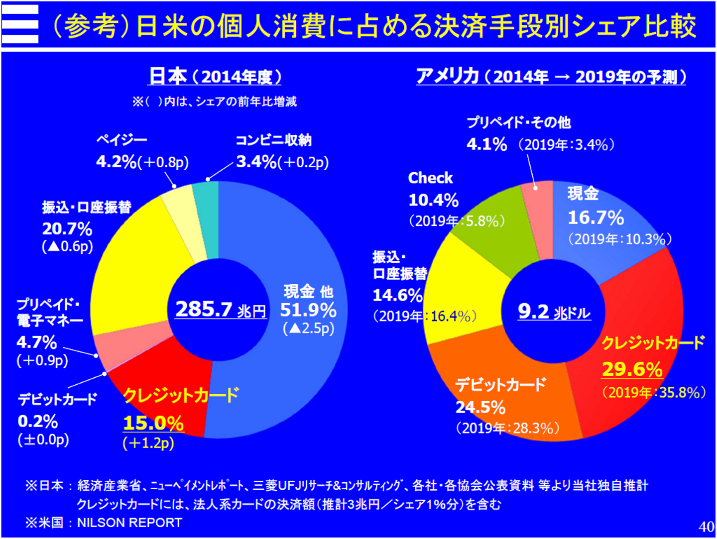 同じく2014年度のアメリカの電子決済率は、クレジットカードとデビットカードとプリペイドを合計すると、なんと58.2%もあります。2019年予想は67.5%です。