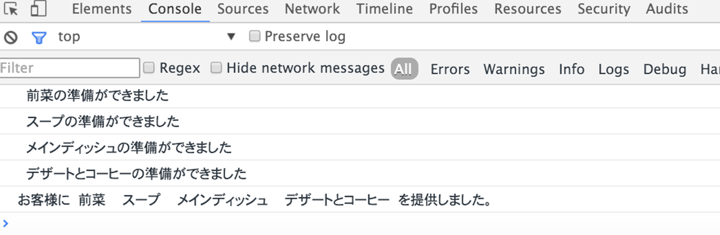 resolve(' 前菜 '); // 戻り値を返して、処理のコントロールをGeneratorに返す。
