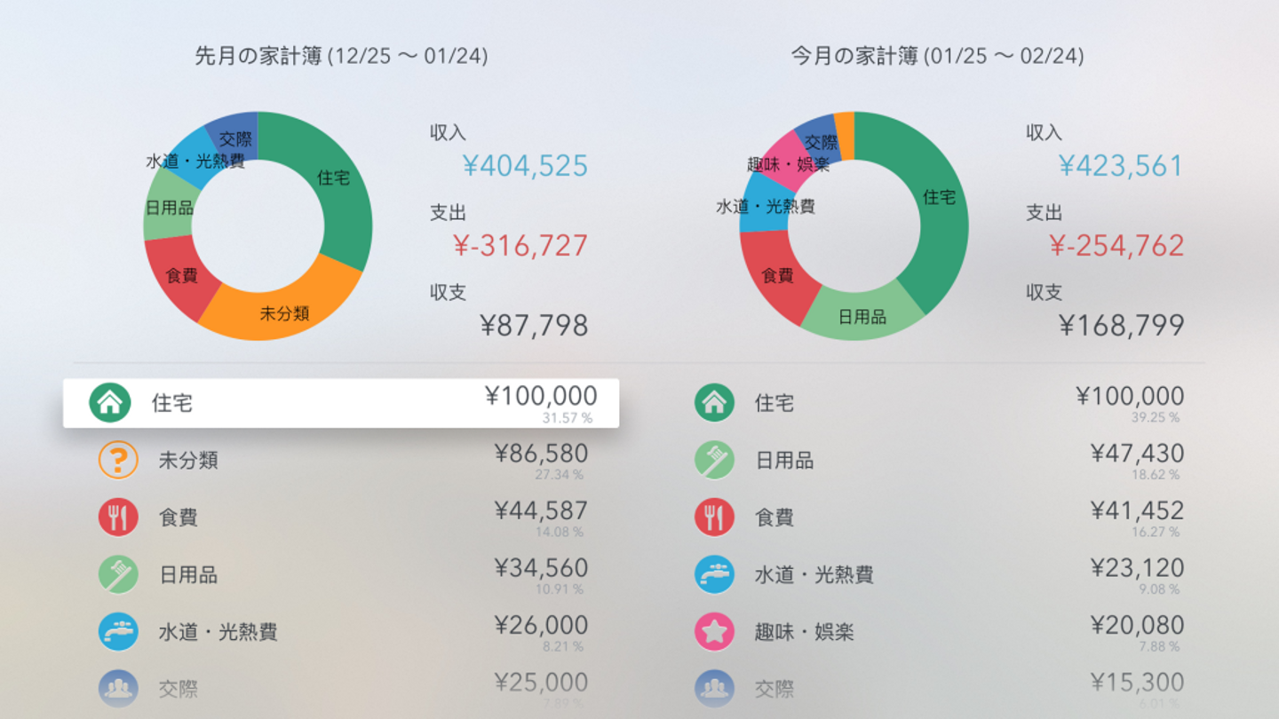 この画面では、先月の家計簿を過去の指標として今月の家計簿の進捗状況をカテゴリの割合、収支、具体的な金額で比較することができるようになっています。