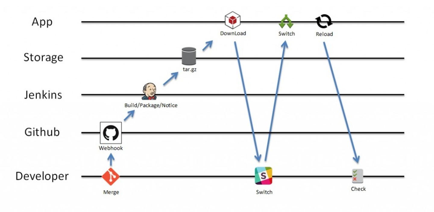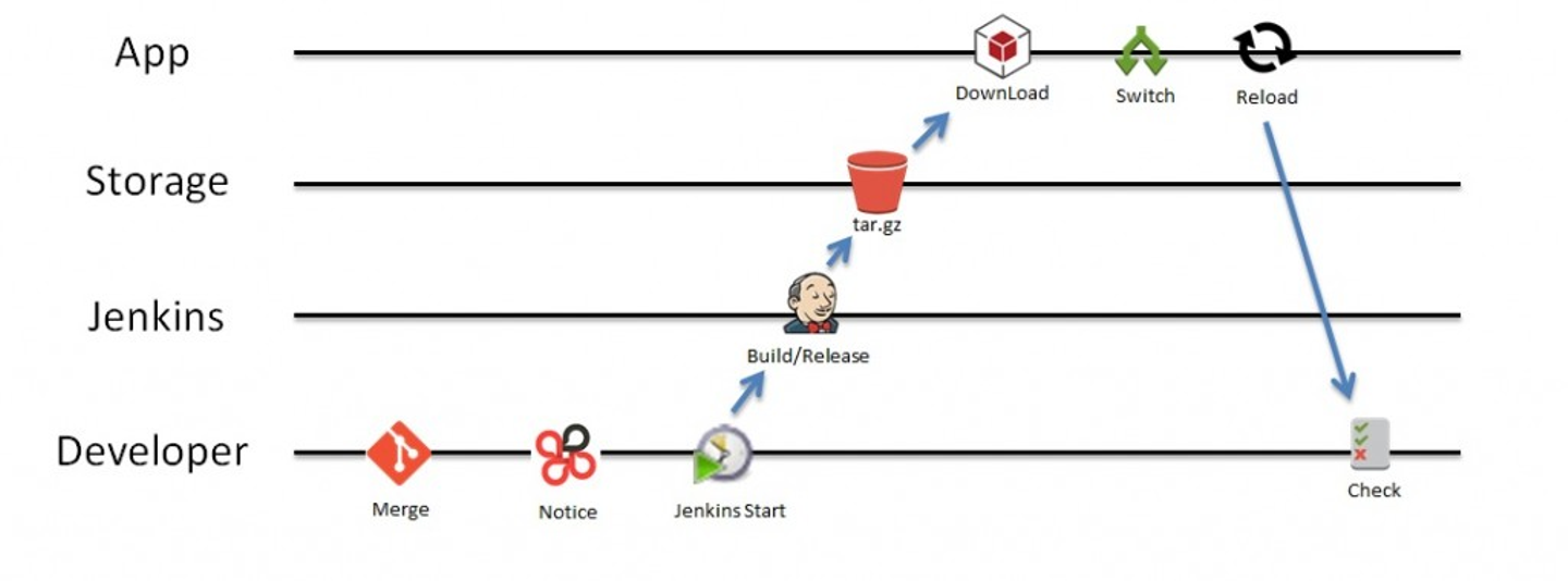 新リリースフローでは、Mergeした時点でビルドが自動で開始され、アーカイブファイルが各サーバーで展開される所まで勝手に行われます。