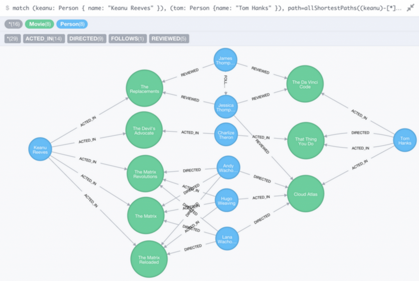 最後に、キアヌ・リーブスさんと、過去共演経験のないトム・ハンクスさんの最短経路を調べます。全てのものごとは6ステップ以内に繋がっているという仮説(参考: 六次の隔たり)とも言われますが、映画界ではどうなっているでしょうか。
