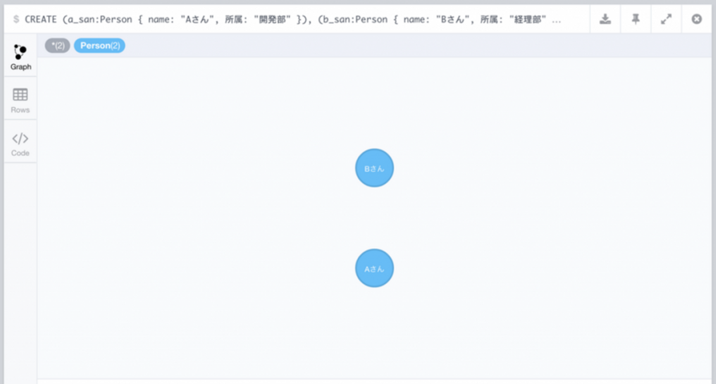 CREATE (a_san:Person { name: "Aさん", 所属: "開発部" }), (b_san:Person { name: "Bさん", 所属: "経理部" })