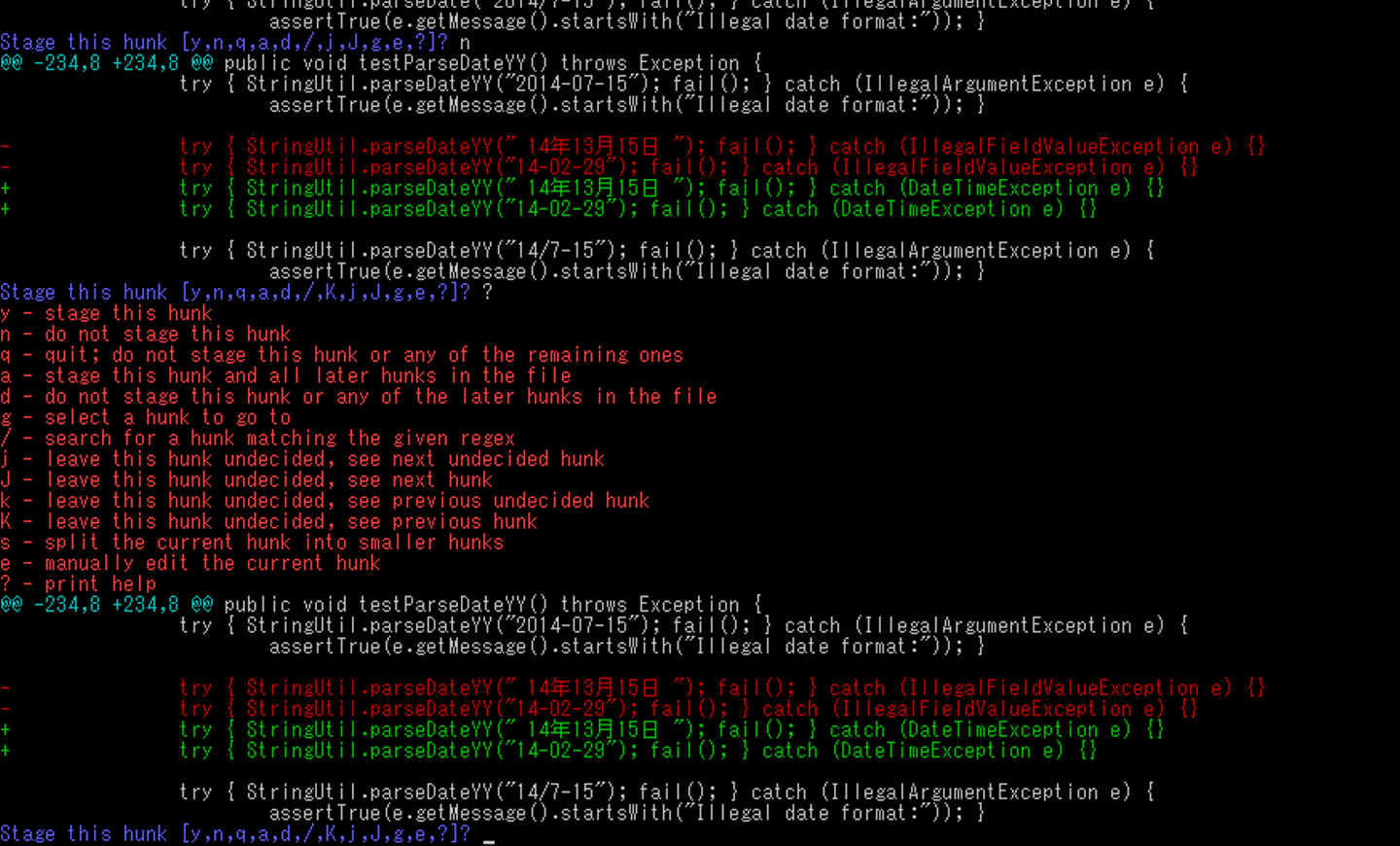 git add -p で追加する「ハンク」を選択します。git reset -p でステージングから下す「ハンク」を選択します。git diff --cached でステージングされている差異を確認します。(add -p、reset -p の時は e を利用すると、行単位以下でもステージング対象にすることができます。)