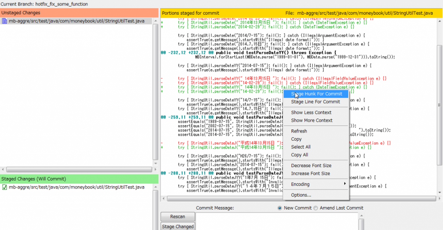 前章ではファイルをステージングに登録してからコミットを準備するという話をしましたが、実際はファイル単位でなく、行又は「ハンク」単位でステージングする事を推奨します。