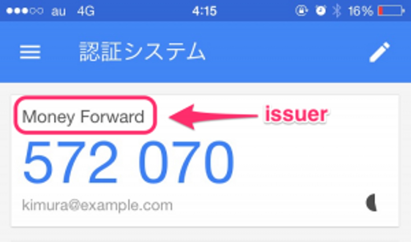 # => "otpauth://totp/kimura@example.com?issuer=Money+Forward&secret=rnibc63l3ylprhpe"