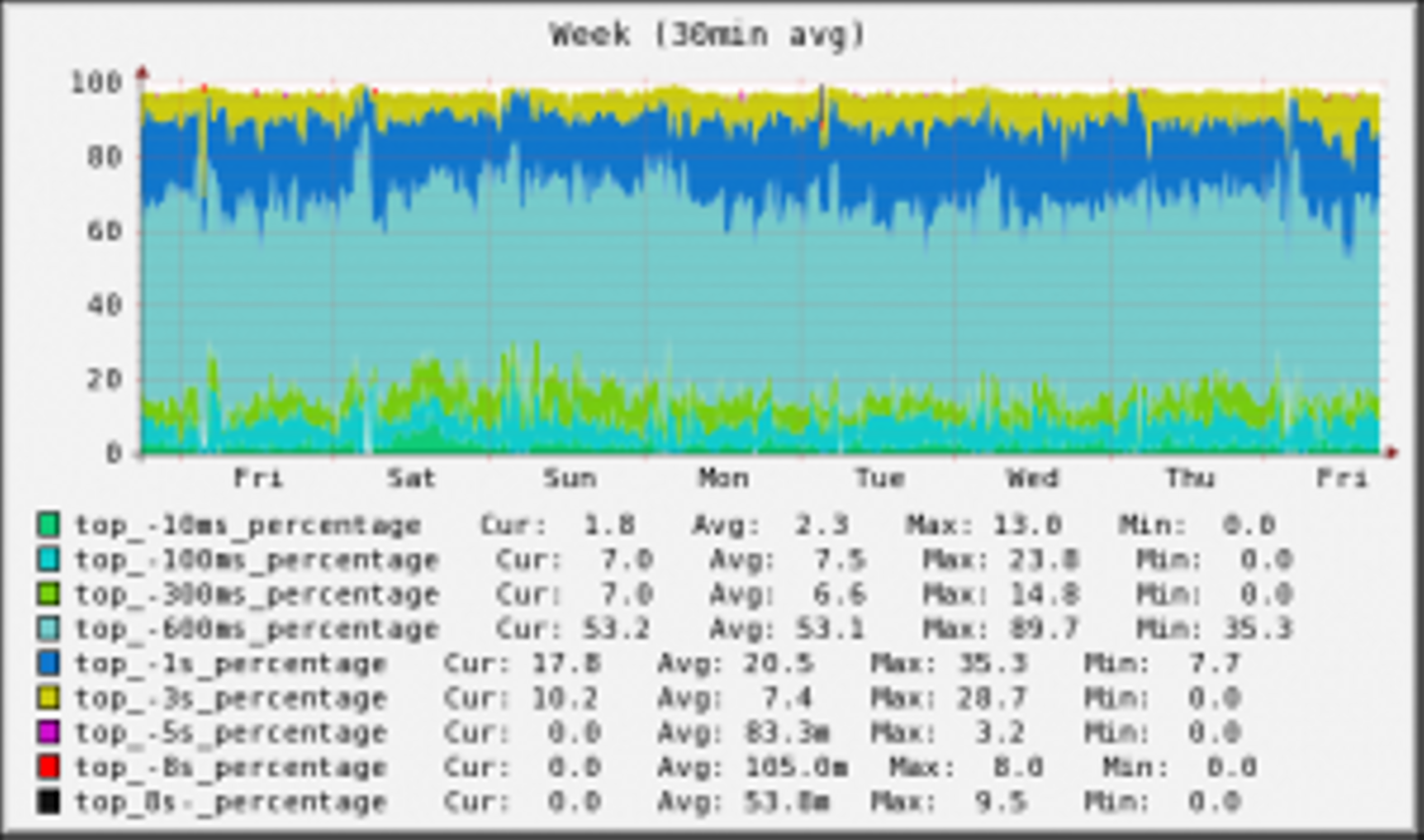 マネーフォワードでは、ウェブサーバーのログファイルをFluentdで収集して、GrowthForecastでグラフにしています。一定時間(30分間隔など)におけるウェブアクセスのレスポンスタイムの内訳を色分けして表示されます。これを日々観察すると変化に気づくことができます。変化があったときに行われた新機能のリリースやユーザーの使い方の変化など、そのときに起こったことを考えて原因を探っていきます。