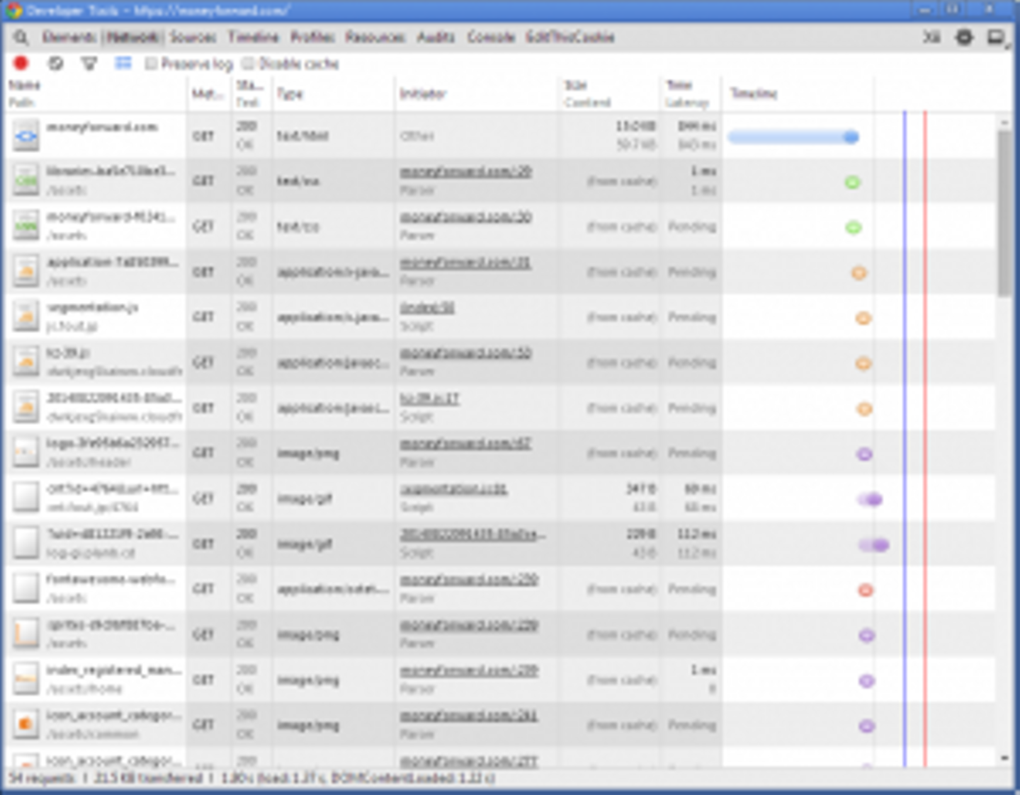 1行目がHTML、2行目以降がCSSやJavaScriptや画像などが並んでいます。青い縦線はメインコンテンツのローディングと解析が完了した時間を示しています。HTMLが約7割を占めています。その他のリソースの大部分は、Size/Content欄に(from cache)と書かれているとおり、ブラウザのキャッシュ機能のおかげでとても短時間で済むようになっています。HTMLのローディングをいかに短時間で済ませるかがポイントになることが分かります。