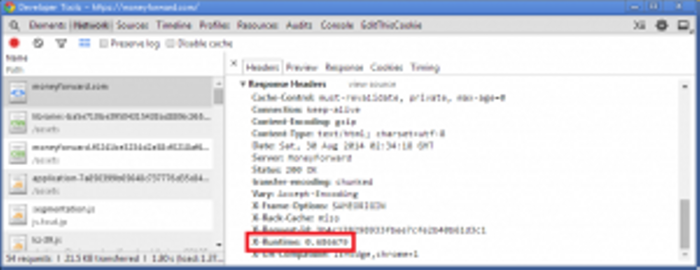 Ruby on Railsは、レスポンスヘッダーのX-Runtimeに、処理にかかった時間を出力するようになっています。先ほどHTMLのローディングにかかった844ミリ秒のうち、687ミリ秒がRuby on Railsでの処理時間であると分かります。
