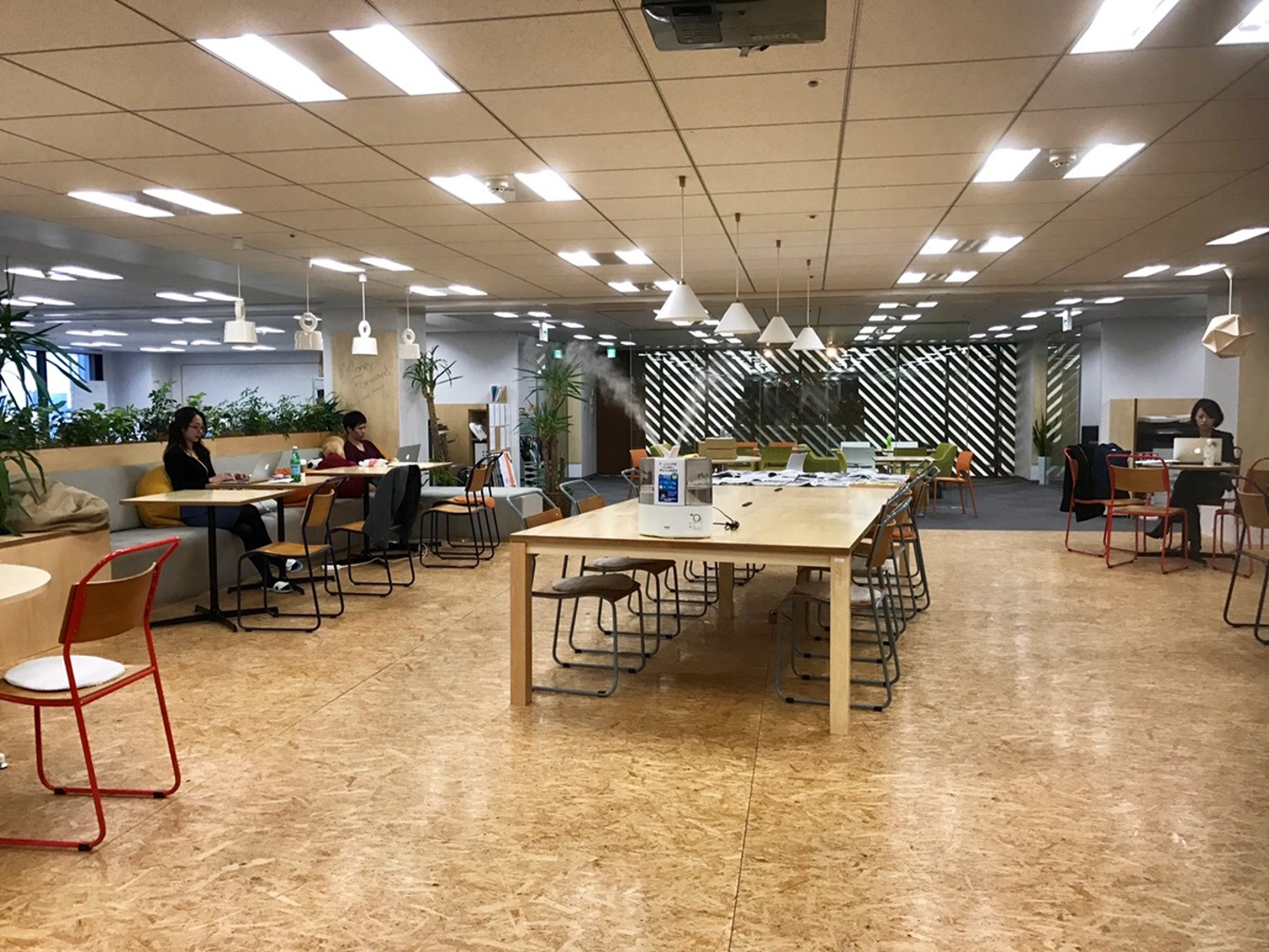 真ん中のテーブルにあるのは加湿器で、オフィスの湿度向上のために、もくもくとがんばっています。