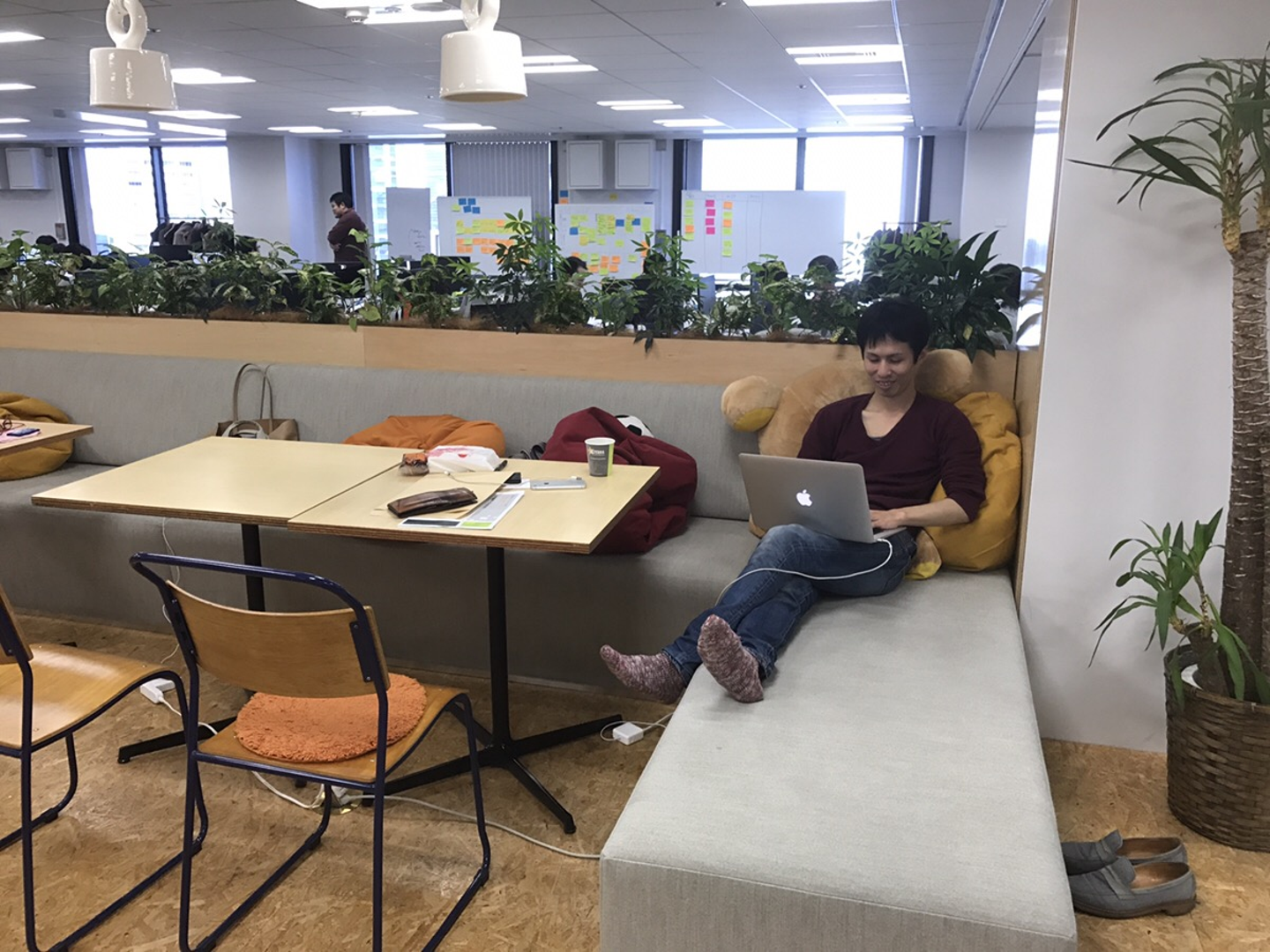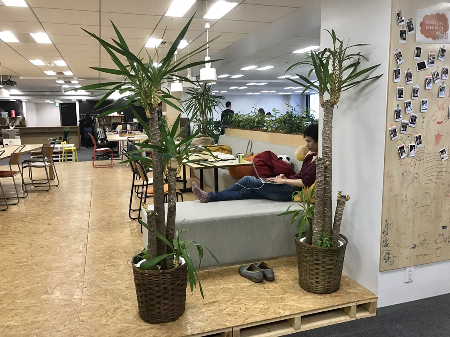 マネーフォワードのオフィスには、ここ以外にも、いろんな場所で仕事やミーティングが出来るように、自由度の高いエリアがたくさん設けられており、「HIROBA」はそのひとつです。