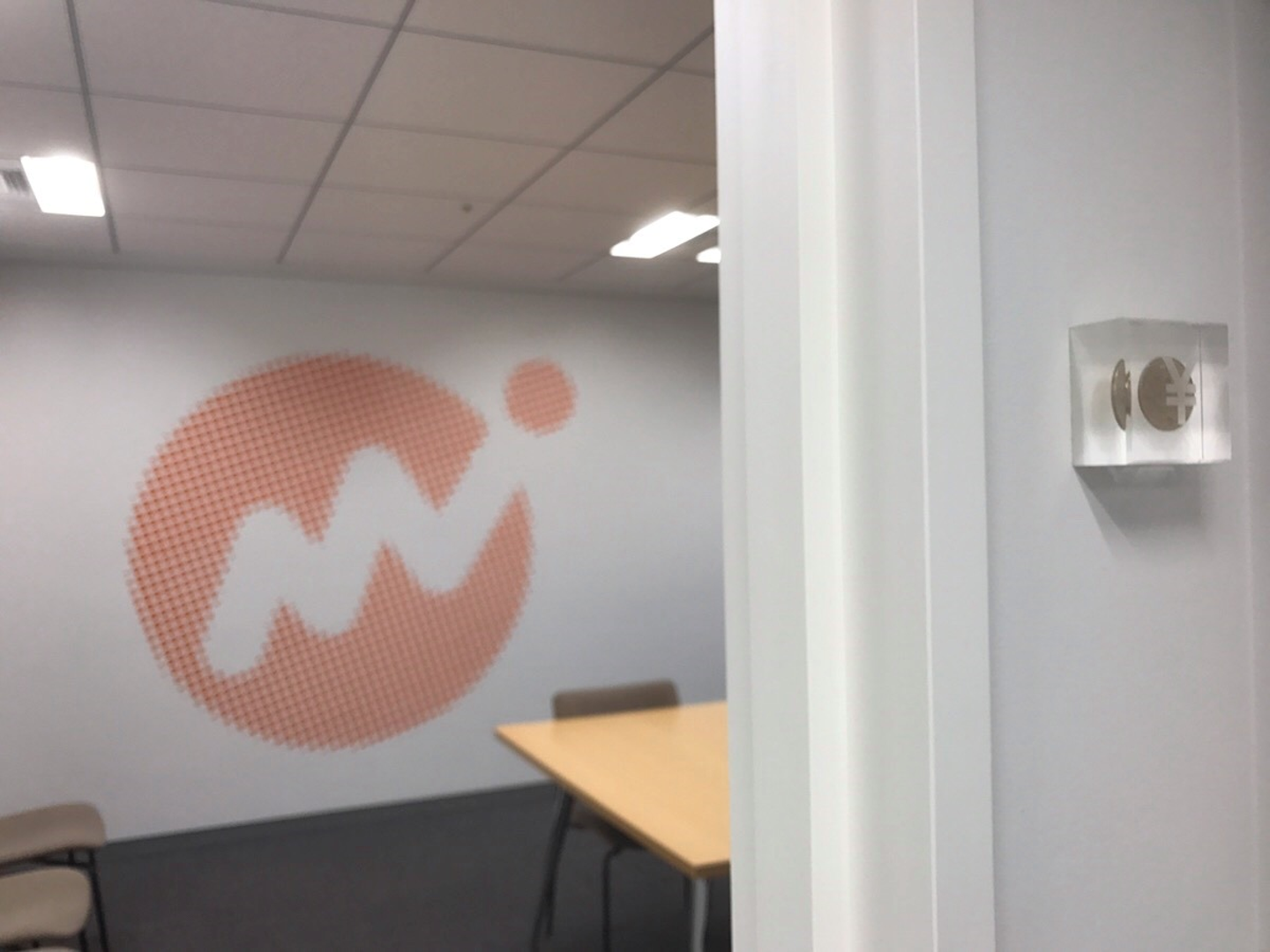 まず最初に…この会議室は、マネーフォワードのロゴマークが書かれた会議室です。