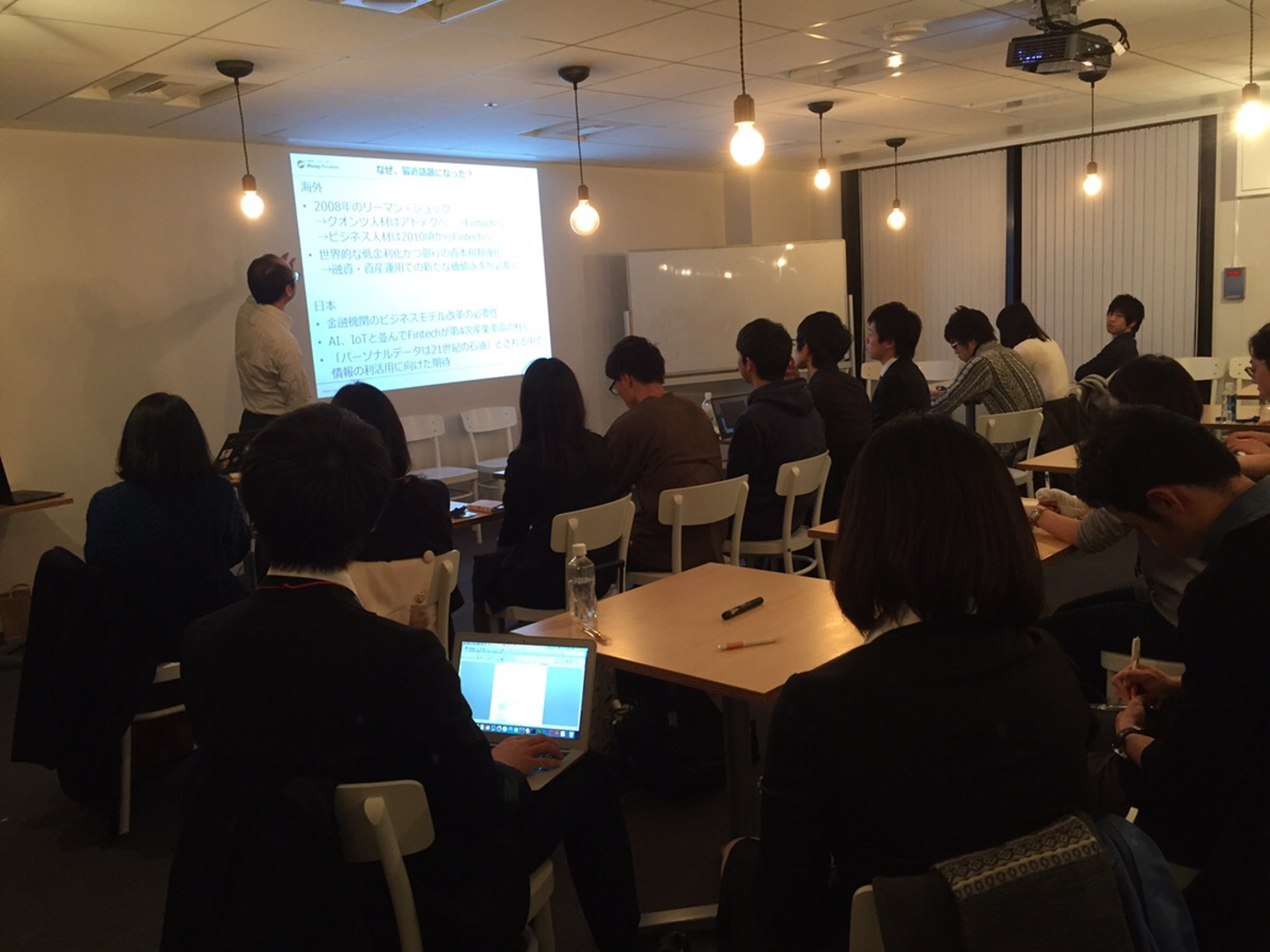 冒頭は、当社取締役兼Fintech研究所長の瀧より、「Fintech」に関するお話をさせていただきました。学生の皆さん、真剣にメモを取っておられました。