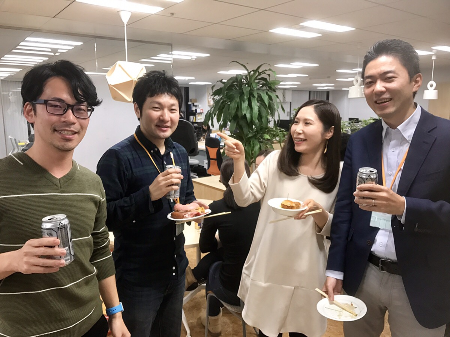 乾杯後は、しばしフリートークタイム。役員、エンジニア、デザイナー、CS、マーケター、ディレクター、営業、アシスタント、バックオフィスなどなど…色んな部署のメンバーが集まり、思い思いに語り合いました。