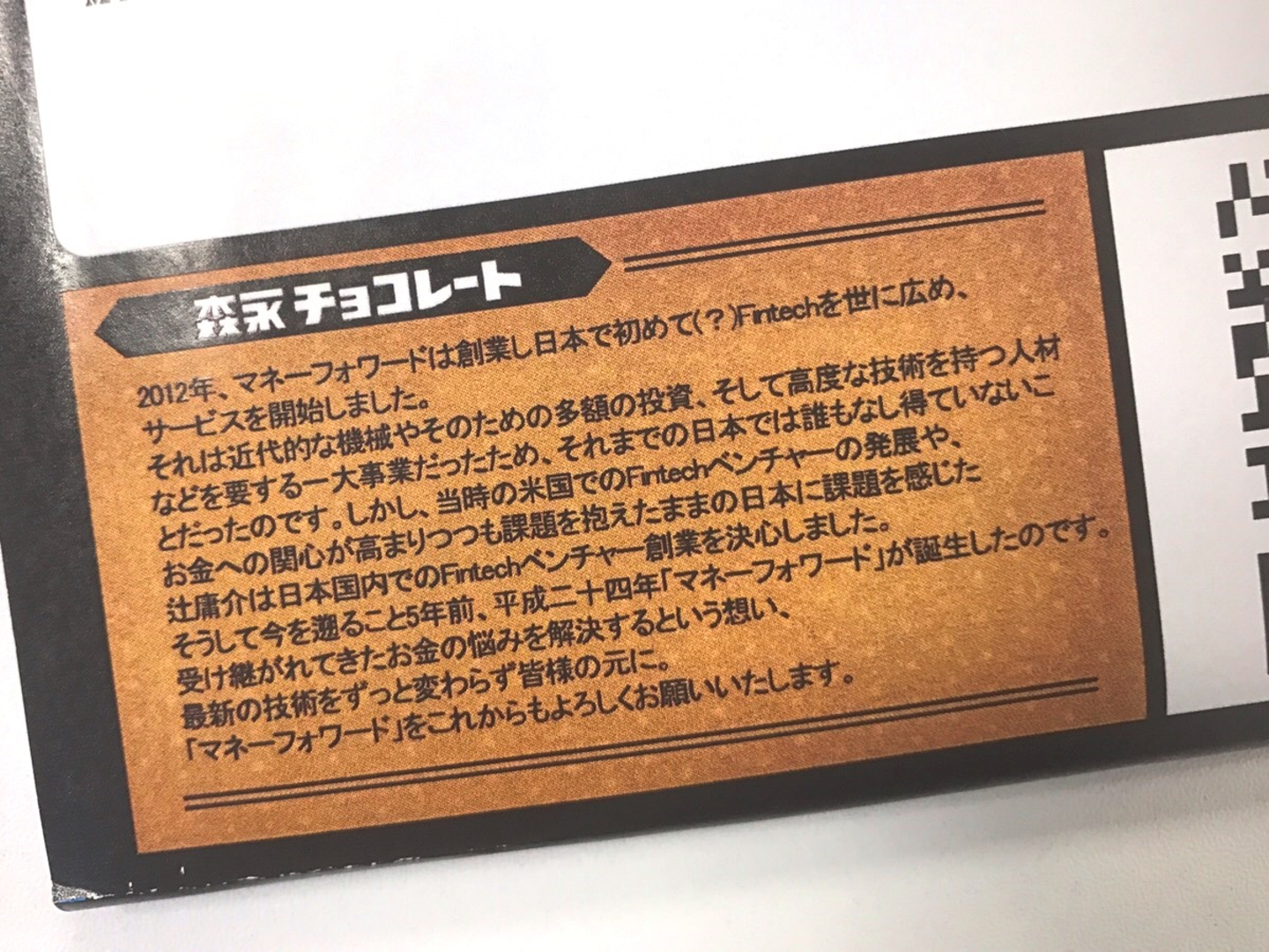 裏面には、マネーフォワードの歴史が印刷されています。て、手が混んでいる…!