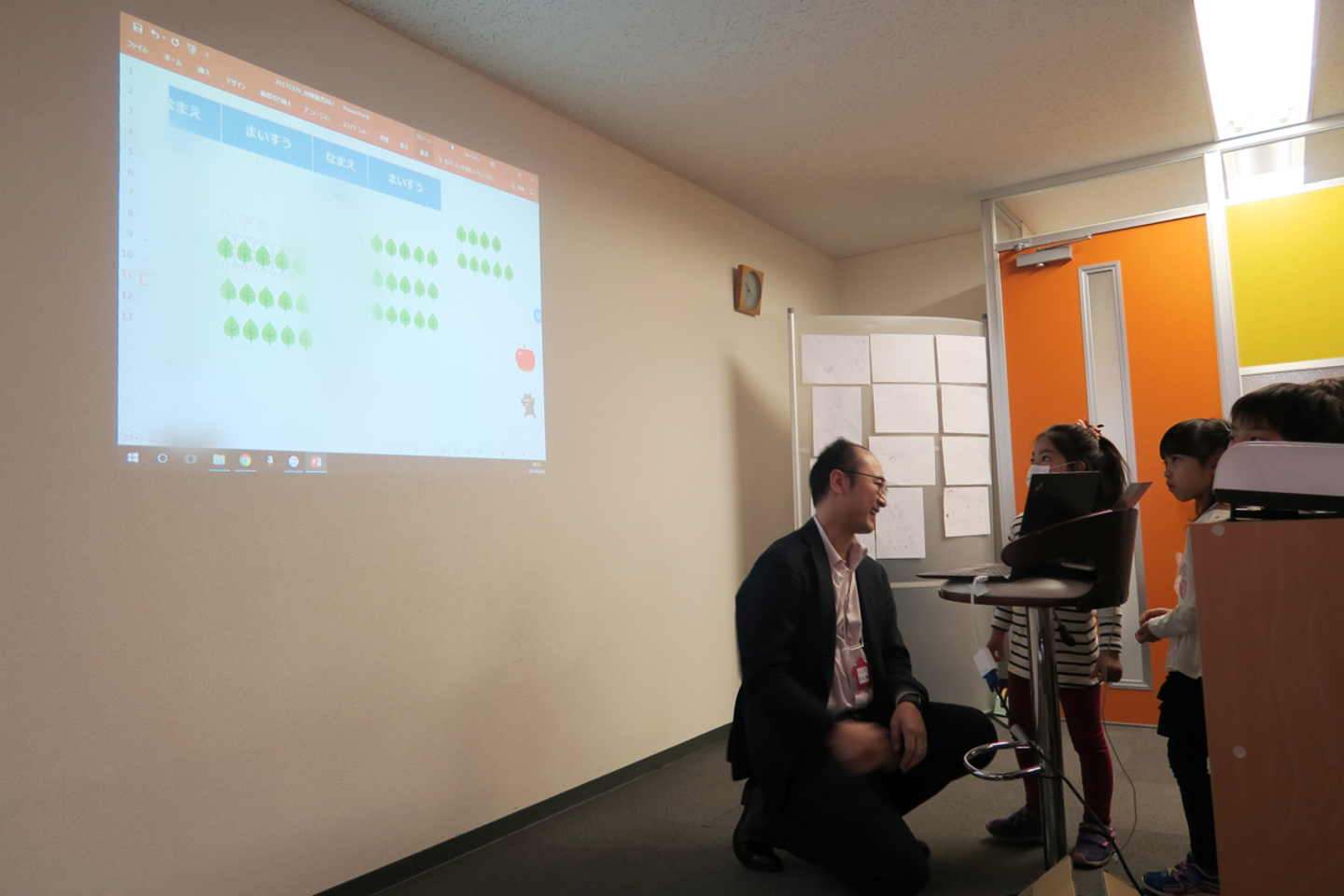 子ども達は自分の名前の横に表示される葉っぱが映ったPowerPointに興味津々です。