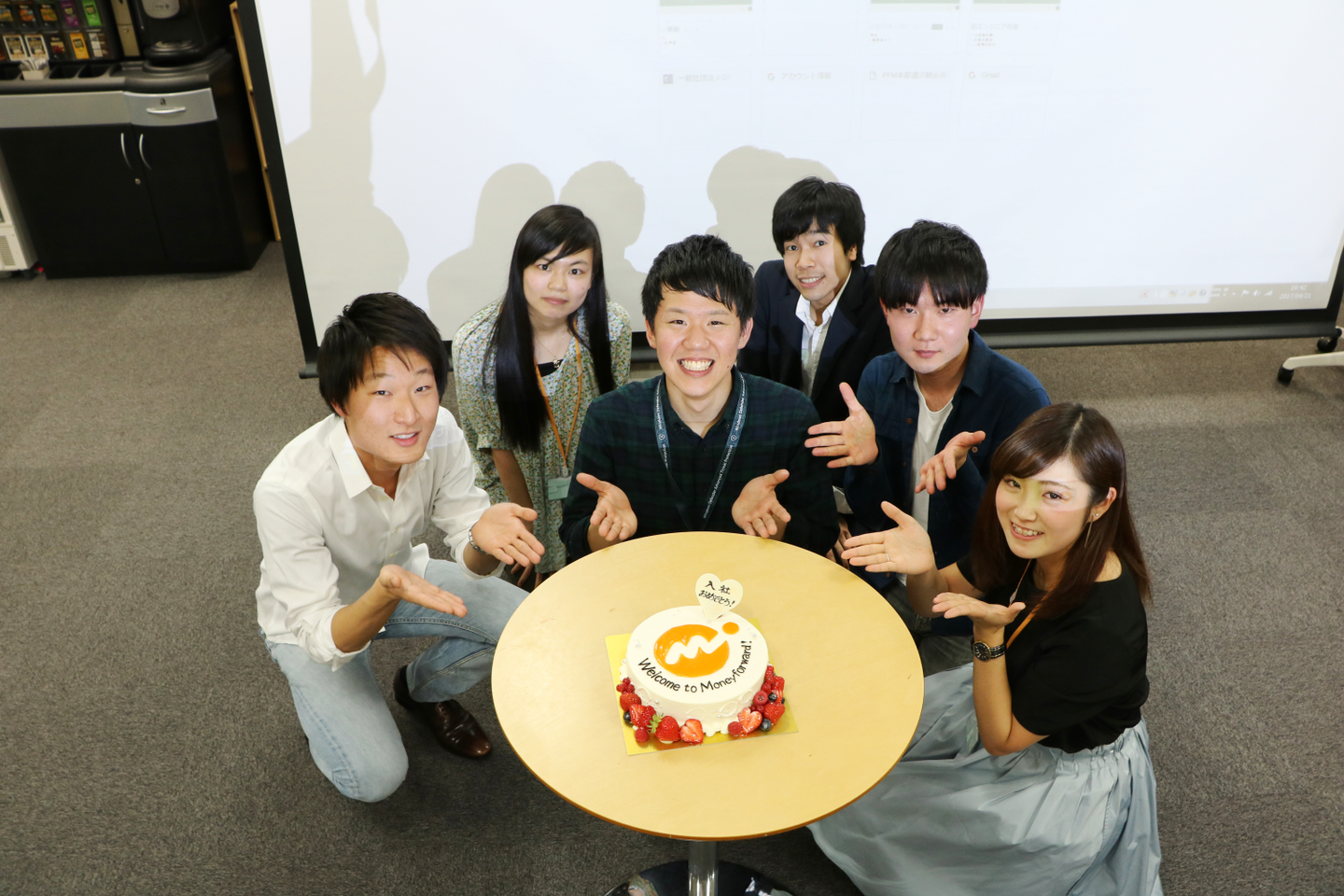 頑張ってムービーを制作した、そして何よりマネーフォワードを選んでくれた新卒のメンバーに感謝の想いを込めて、サプライズでマネフォケーキを贈呈!皆で改めて入社をお祝いしました。