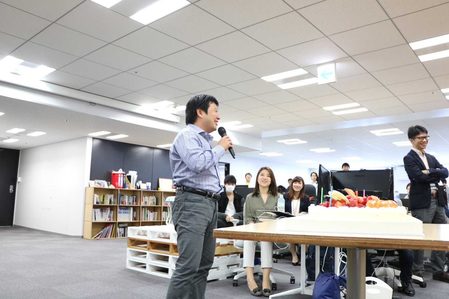 「創業5周年を迎えられたのはここに居る皆さんのおかげです。いつも思っていることですが、マネーフォワードは人材が宝です。ここに居てくれる皆が居なければ、今日までくることはできなかった。来年の6周年には、更にたくさんの仲間と、世の中に向けてもっと価値を届けられる会社にしていきましょう。」と伝えました。