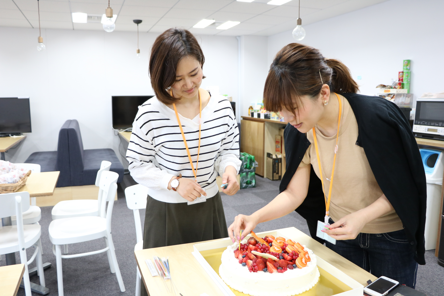 ケーキを仕込む人事メンバー。バランスを確認しながらロウソクを準備しています。