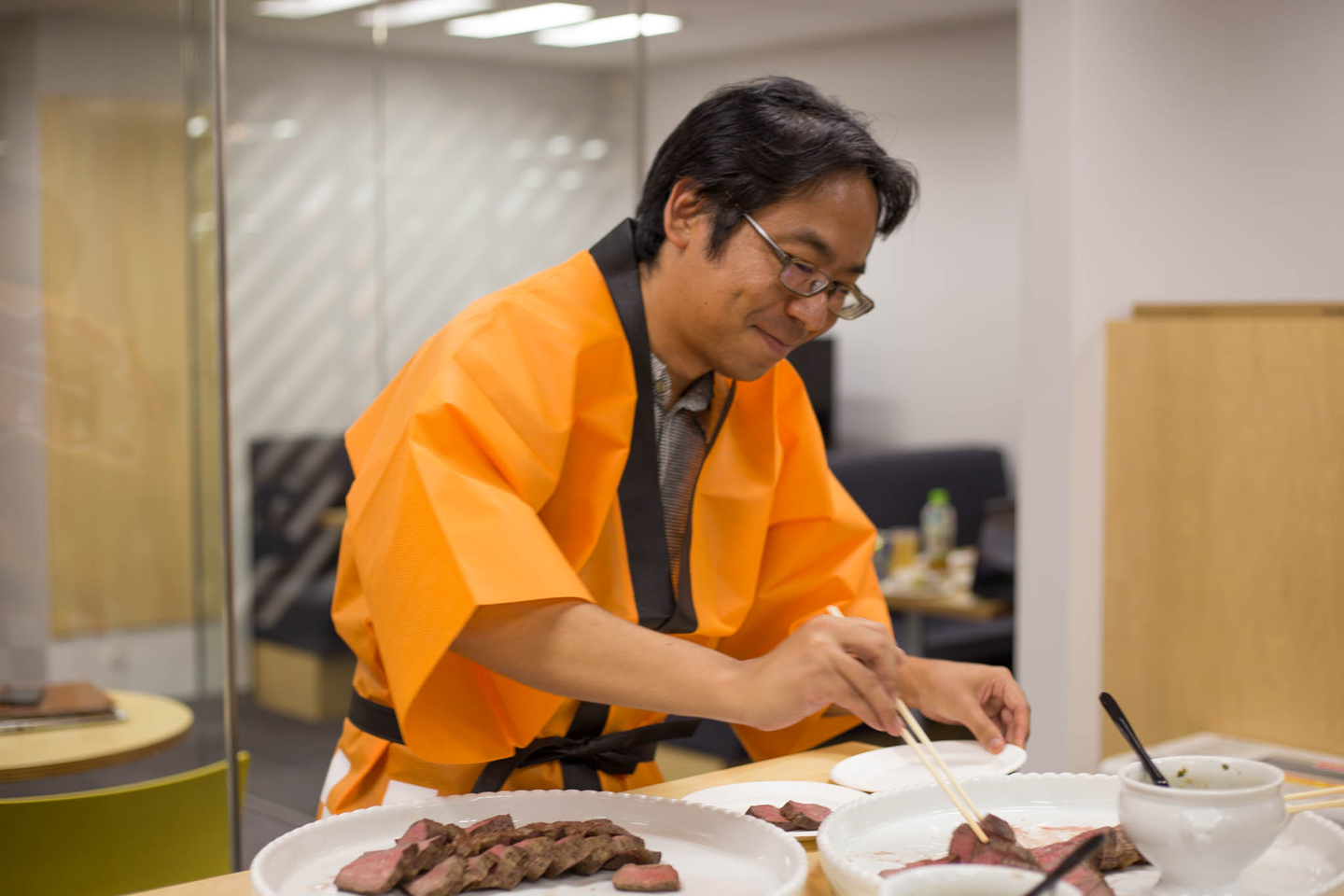 乾杯後、すぐに屋台の周りは人でいっぱいになって大賑わいでした。人事部長の服部も屋台でメンバーをおもてなし。お肉を取り分けながらいい笑顔です。