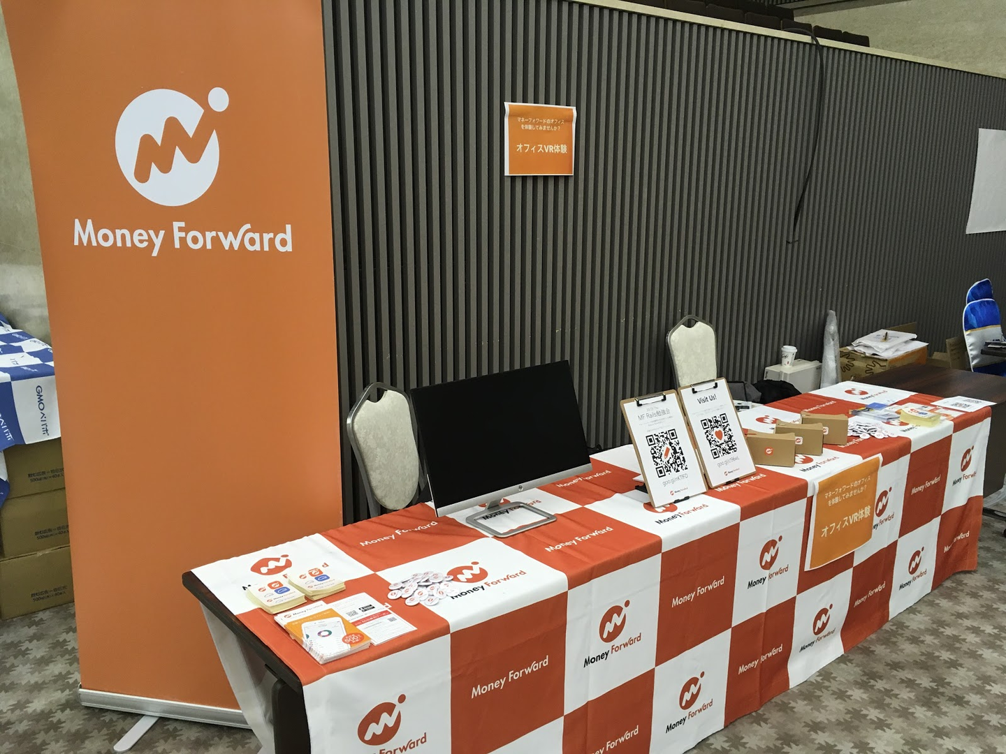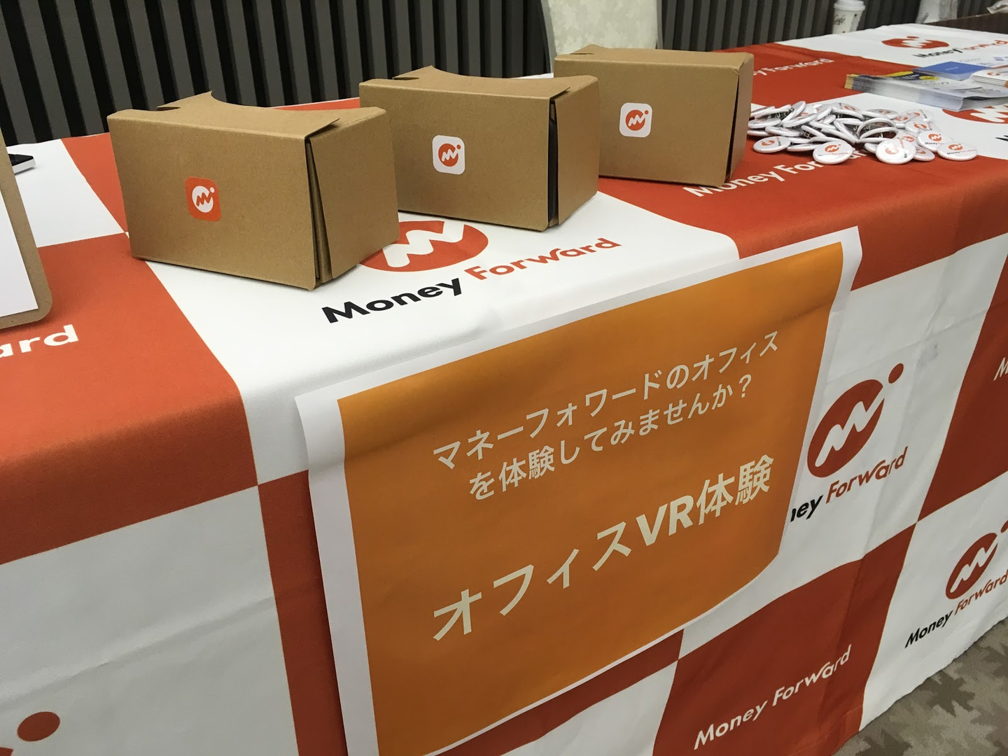ブースでは各種ノベルティのほかに、VRでオフィス見学体験をできるアイテムを用意して、ゲストの皆さんに会社を覗いてもらっています(リアルでも遊びに来てね!と言いつつ)。