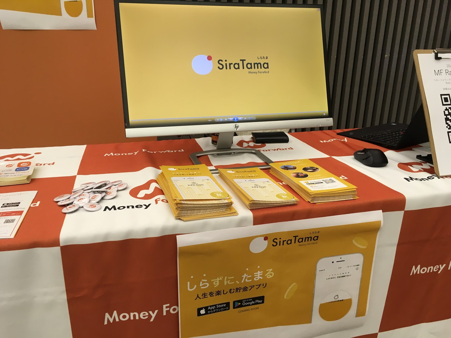 さて2日目には、マネーフォワードの新サービス「しらたま」のリリースが発表されましたので、ブースでも紹介動画を流したり、パンフレットでサービス紹介をスタートしました。