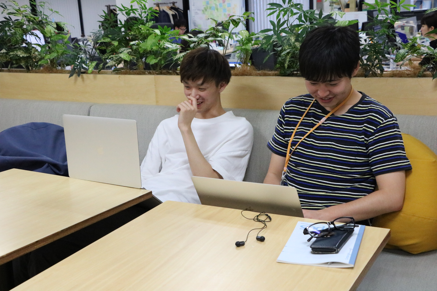 ↓事前打ち合わせをして、資料作成をするエンジニアインターンのメンバー (余談ですが、この様子をみた社員からは「なんかあそこほのぼのしてる」「マイナスイオンが出てそう」という声がちらほら)