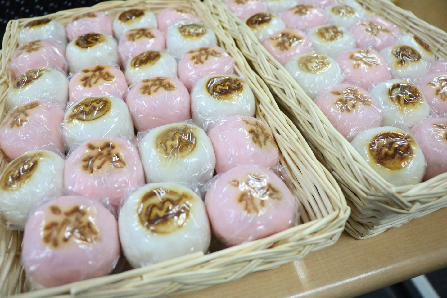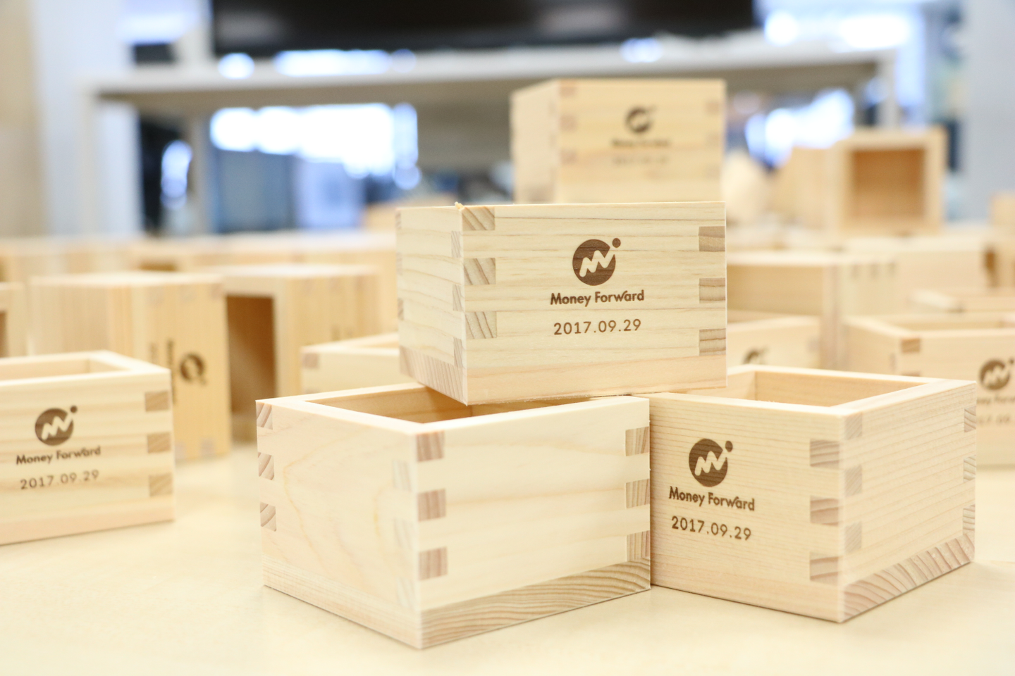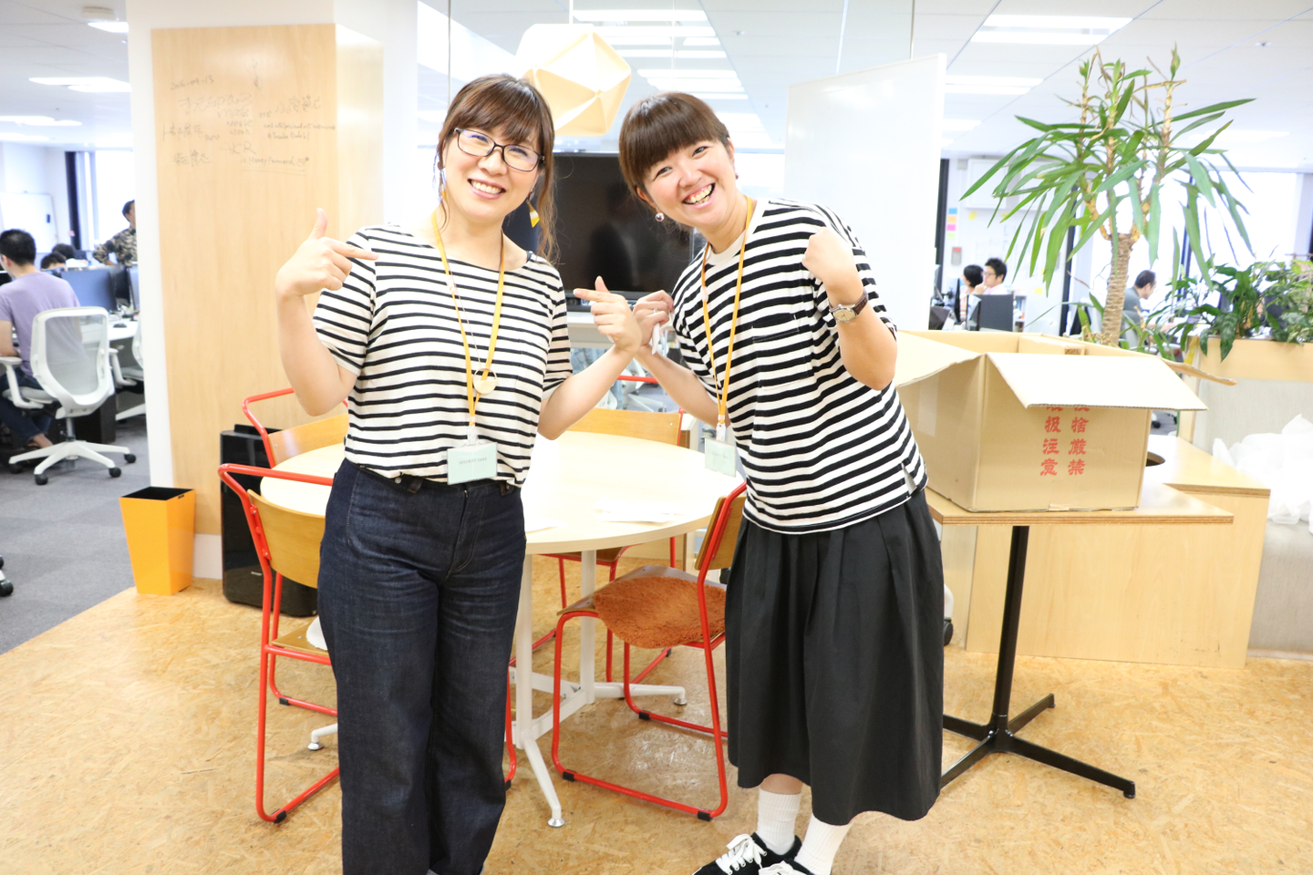 ささやかなお祝いとして、メンバーには紅白饅頭、升、記念ステッカーを配布しました。こちらは升を準備中だった人事の西野さん(左)と堀さん(右)。なんと本日双子コーデでした(笑)。
