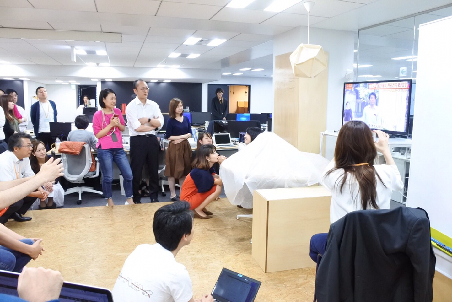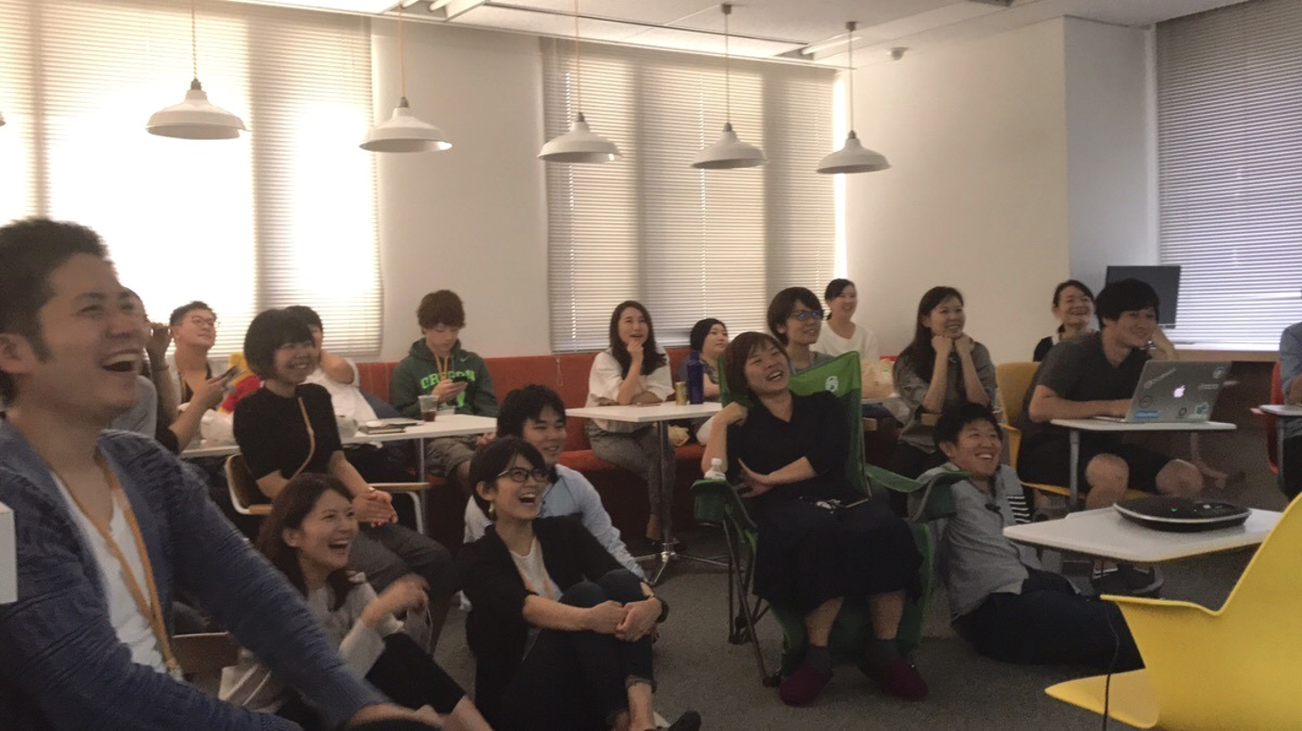 社内ではフリースペースにて、上場セレモニーの様子を中継していました。こちらは森ビルオフィスの様子。皆良い笑顔です(^o^) ※撮影者はIPOプロジェクトメンバーの経営企画本部の寺本さん。