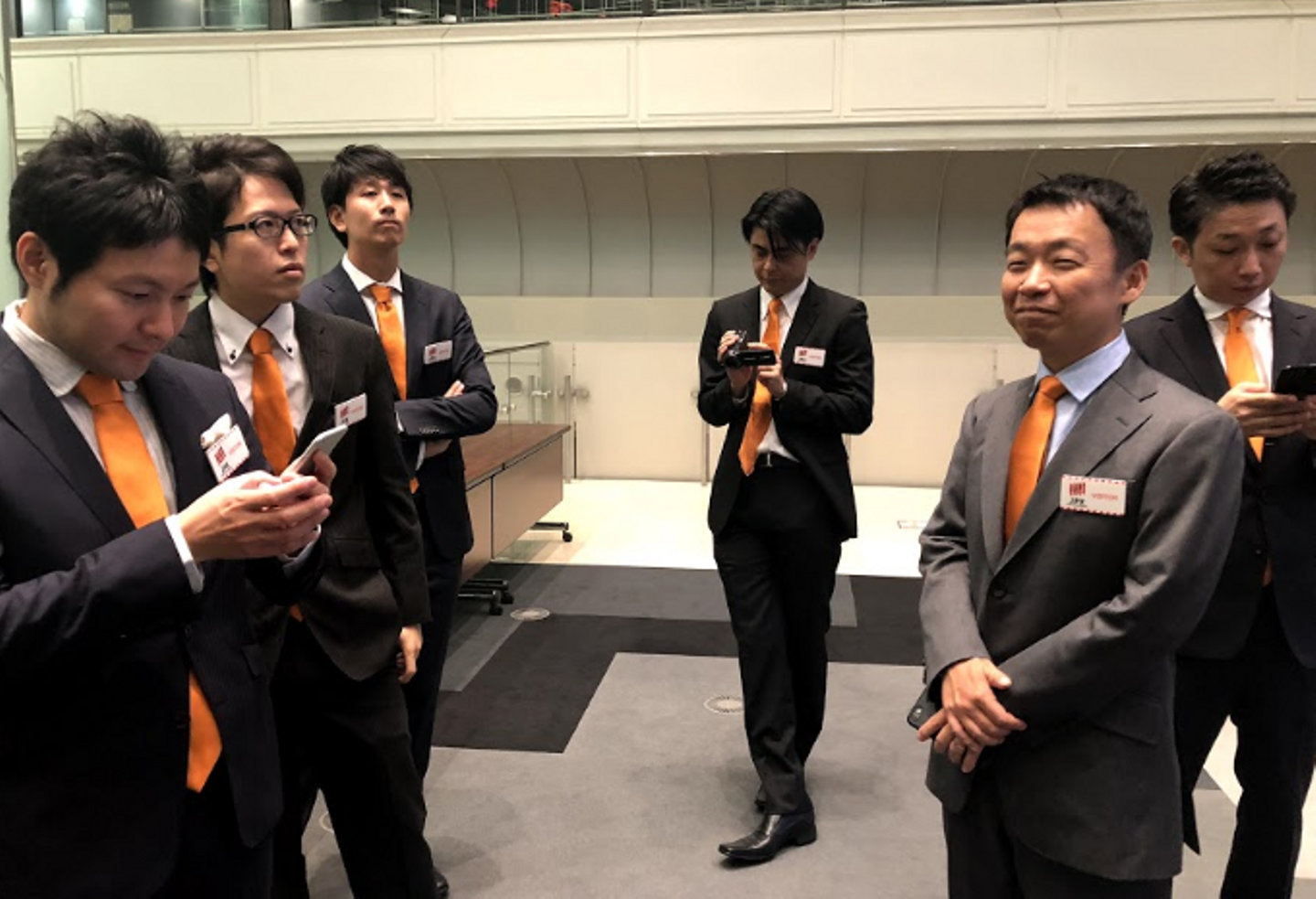 セレモニー終了後は、東証の1Fで各々記念撮影。改めて喜びを噛み締めます。女性メンバーのオレンジのスカーフもこの日のためにセレクトしました。