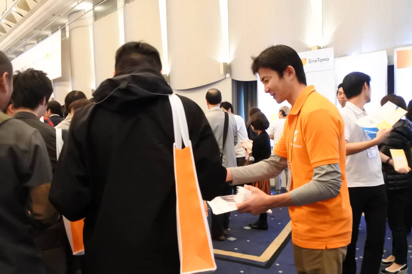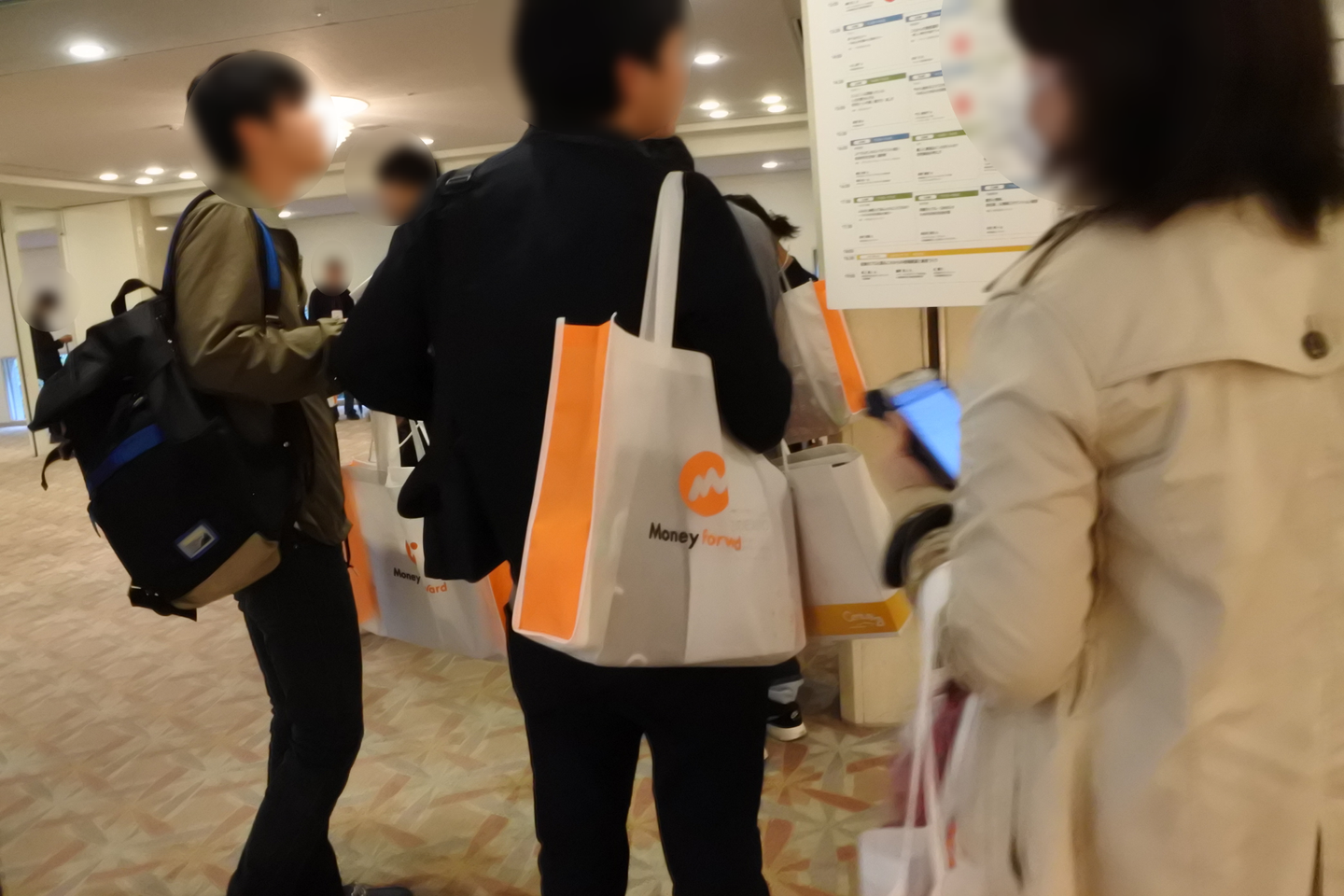 お配りしたマネーフォワードバッグを持ったお客さまがたくさん。