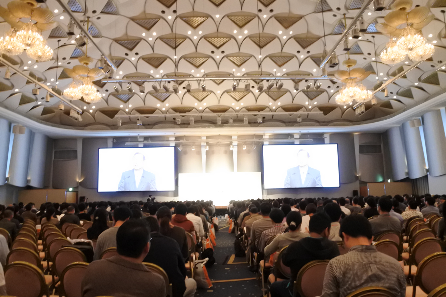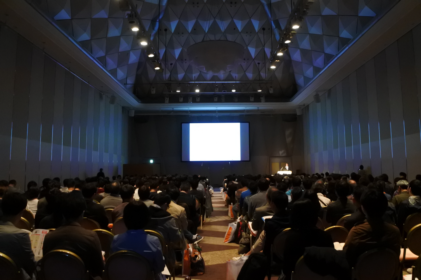 基調講演会場では、最初に代表の辻より、早朝より悪天候の中でお越しいただいたことへの御礼、そして開演のご挨拶をさせていただきました。