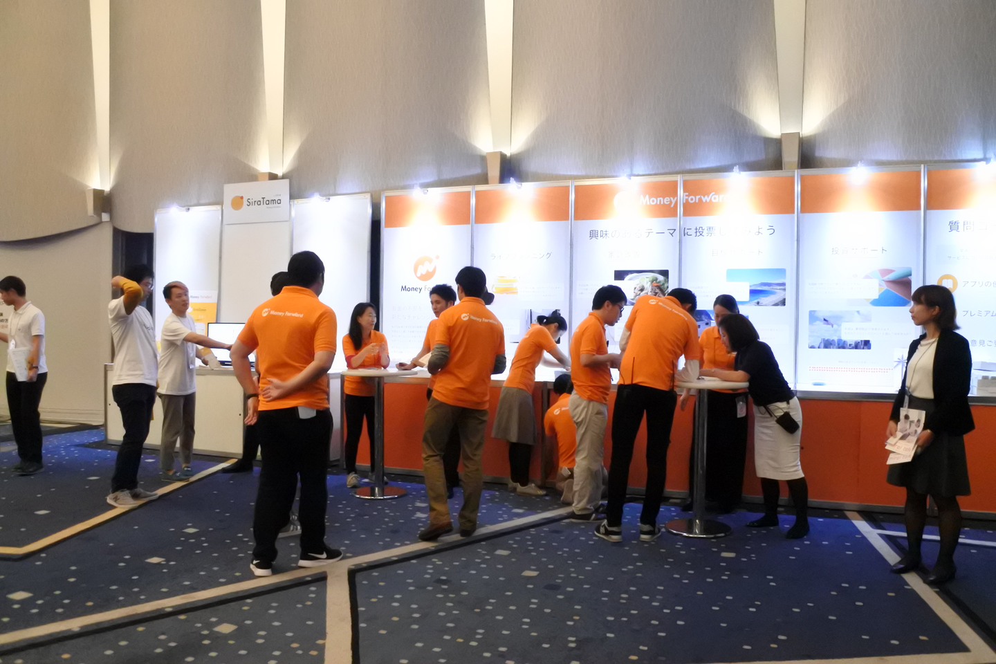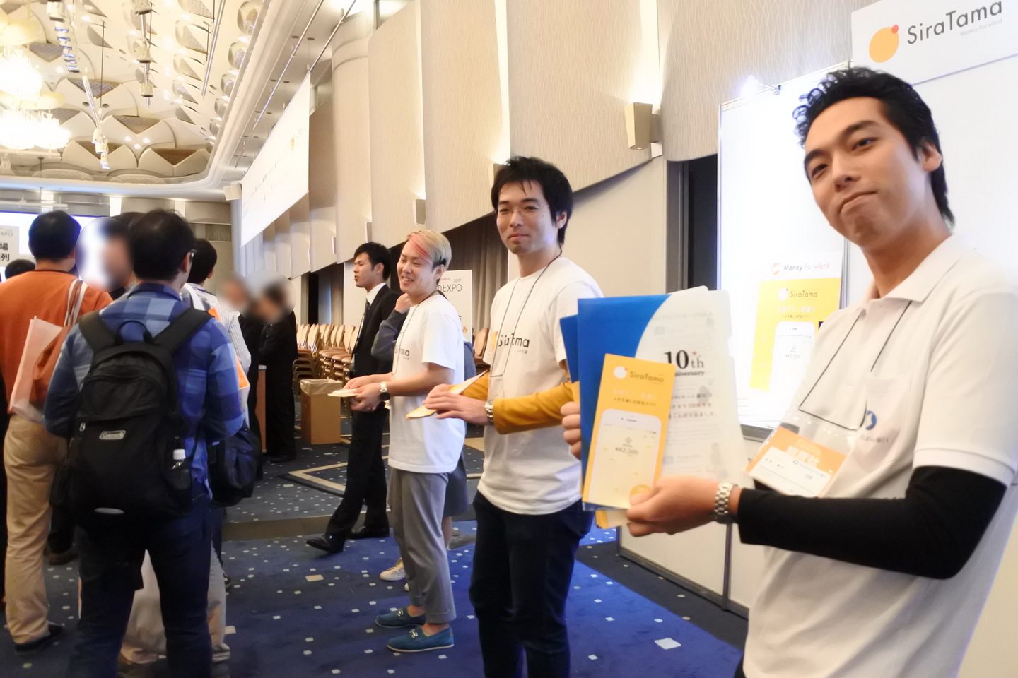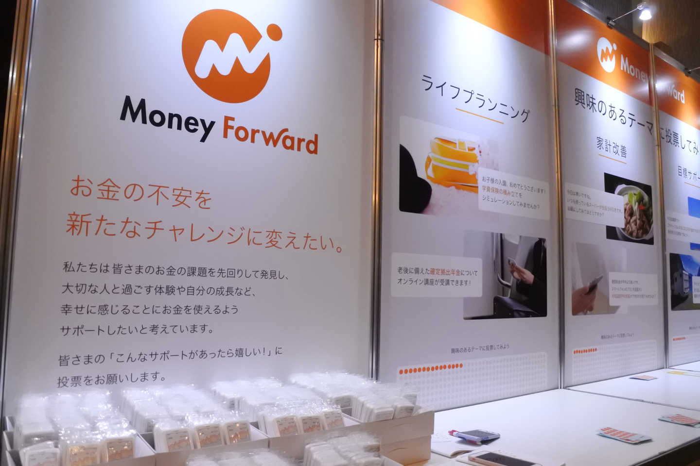 こちらはブース会場の『マネーフォワード』(右) と先月発表した新サービス『しらたま』(左) のブースです。