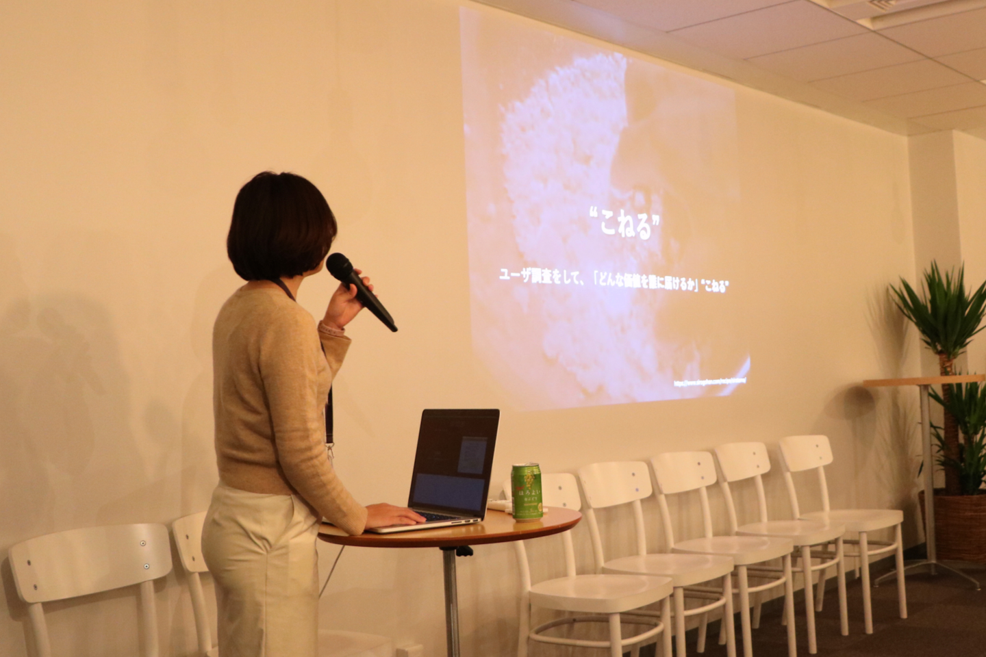 つぎに、デザイナーの大橋より、「しらたまの作り方」と題して、白玉団子の作り方になぞらえてサービスの企画や開発フローについてお伝えしました。