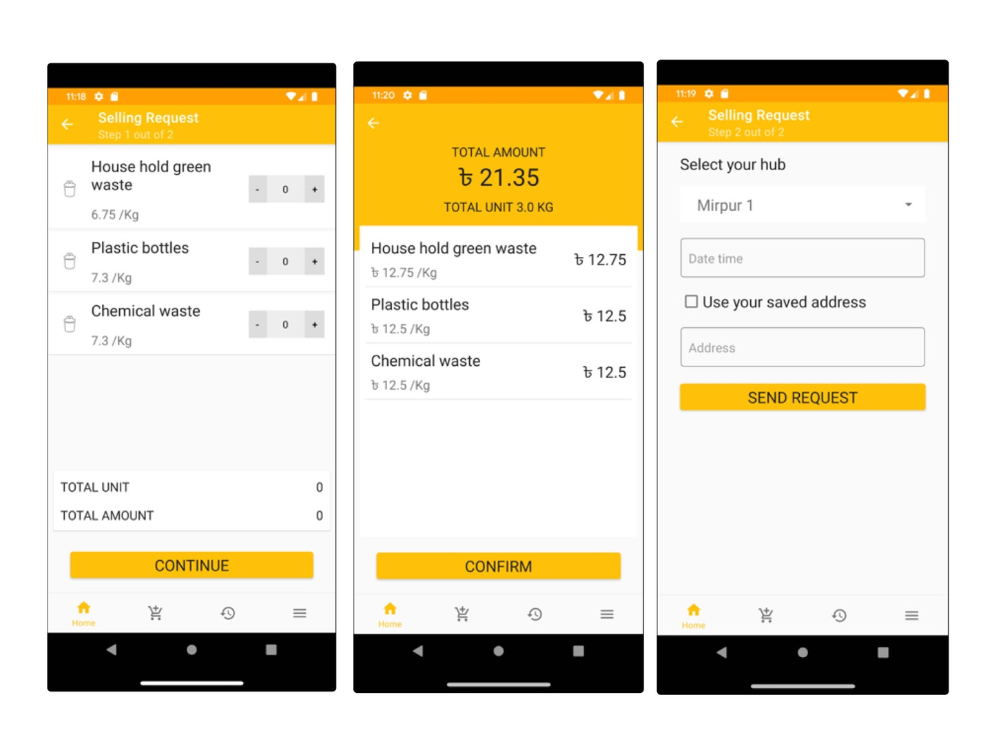 ユーザー側:ゴミの種類、量を選択しゴミの金額を簡単に知ることができます。またアプリ上で、回収しに来てほしい場所や日時を設定することで労力をかけずスムーズにゴミ回収の依頼ができます。