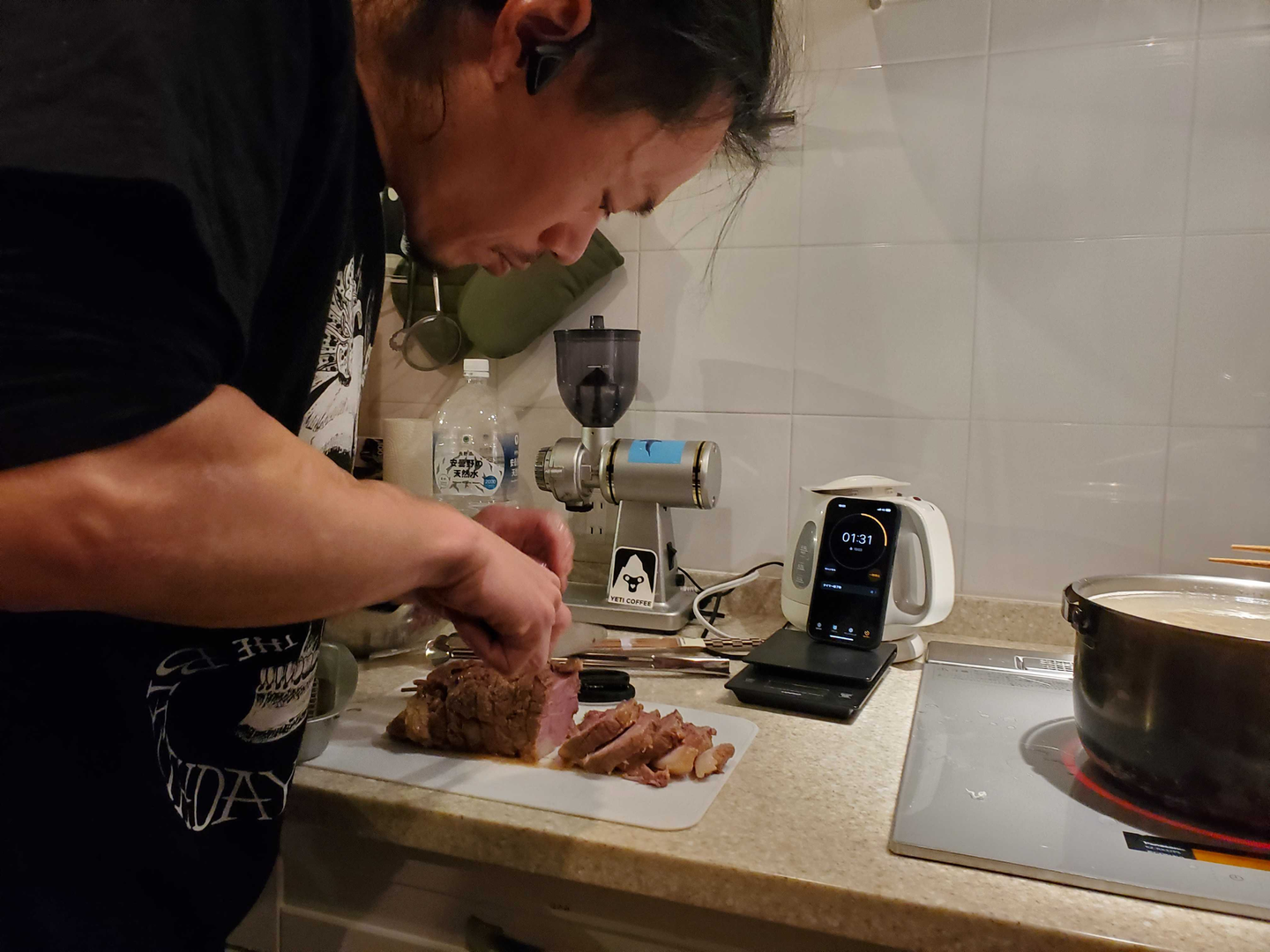 オフィスの換気はしっかり行ってから、IHコンロに鍋を3つセットしましょう。1つ目は、持ち帰ったスープの保温用。2つ目は、チャーシューの湯煎用。3つ目は、麺の茹で上げ用です。麺が茹で上がり、チャーシューの切り分けが出来たら、あとはどんぶりにスープを注いで盛り付けるだけです!