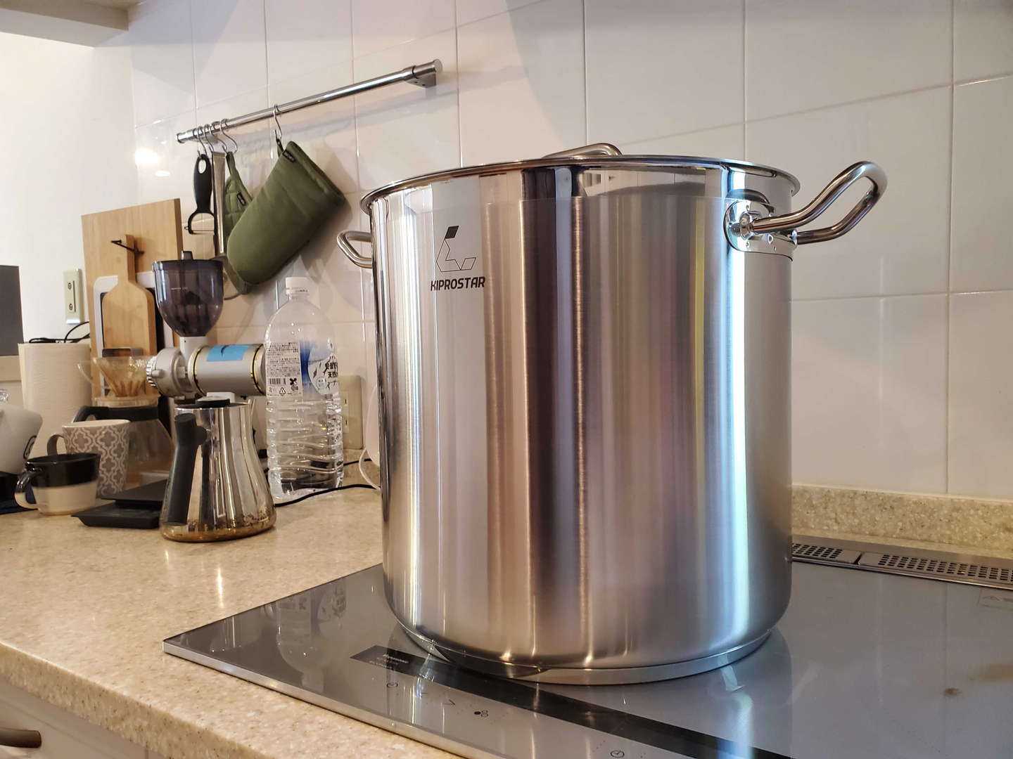 今回は、総勢11名のメンバーが集まり、お鍋を調達するところから始まりました。今後の鍋二郎の規模拡大と、運搬中にスープが漏れ出る可能性をふまえ、気合を入れて約21Lで密閉性の高いIH寸胴鍋を購入しました。実は、このサイズが大正解で、お店でスープを入れてもらうと写真の寸胴鍋七分目ぐらいになり、ちょうど良かったです。密閉性も高くスープや匂いが漏れ出す心配もありませんでした。