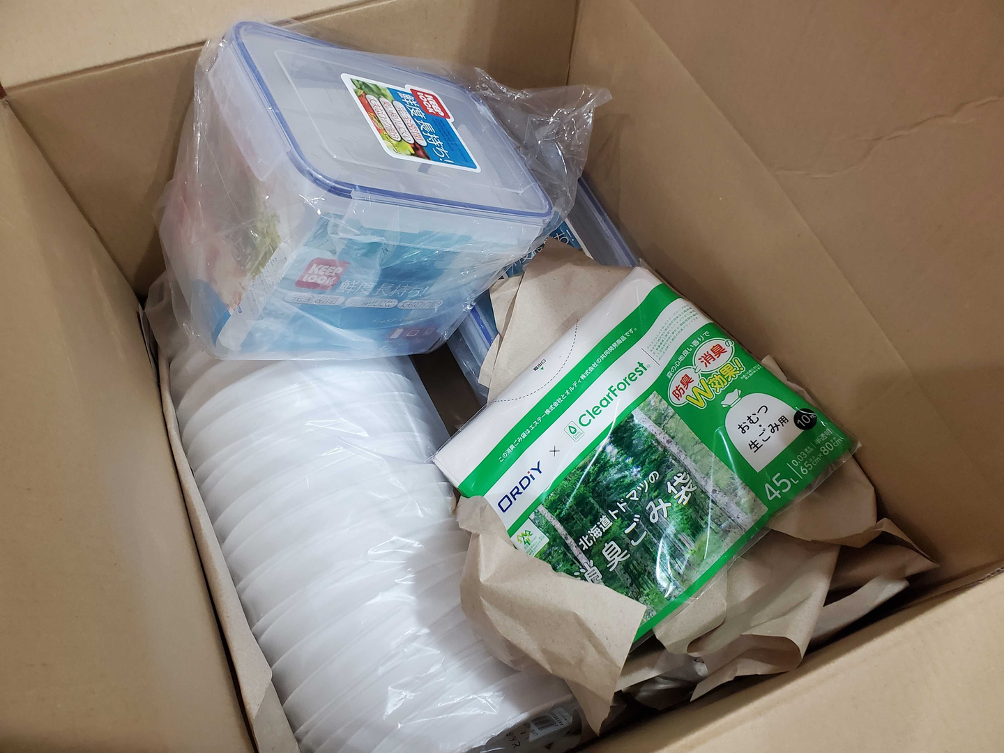 続いて、もやしとニンニクを入れるタッパーと、スープ・トッピングを運ぶ際の消臭袋の用意もしました。22L x 15.5W x 16.5H cmのタッパー2つと、北海道トドマツの消臭ゴミ袋を用意しましたが、これまたちょうど良かったです。スープが重たく手で持って鍋を運べないのでタクシーを使いましたが、消臭袋に収めると油臭さが一切なくなり、スマートに鍋二郎セットをオフィスまで持ち帰ることができました。