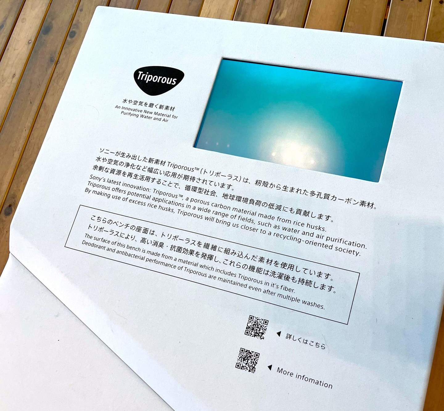 画像内(ロビーのベンチ)にもあるように、トリポーラスとは、世界中で年間約1億トンも排出されるお米の籾殻から生まれた多孔質のカーボン素材のことで、三種類(トリ)の孔(ポーラス)を持っていることから、その名がつけられました。(※Triporous(トリポーラス)は、ソニーグループ株式会社の商標です。)