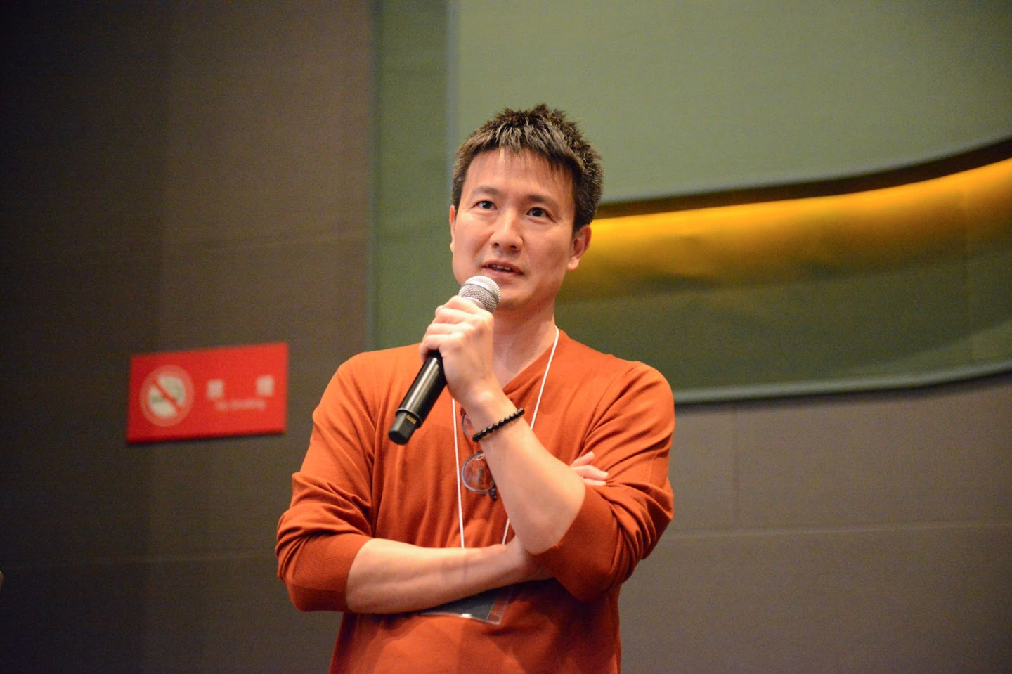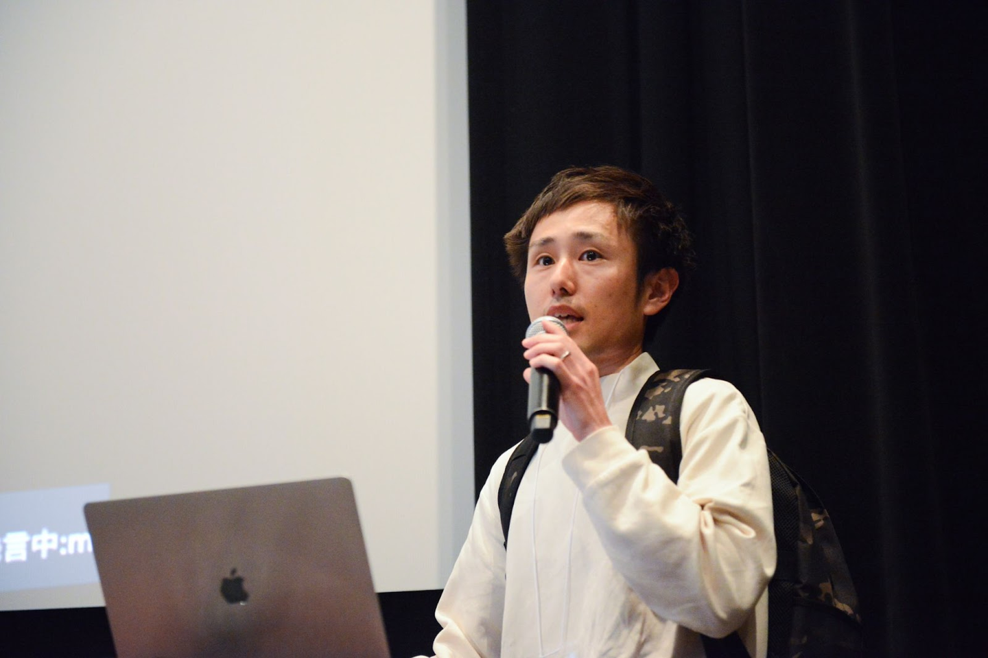 バッグブランドのCOOらしくバッグを背負って登場しました。