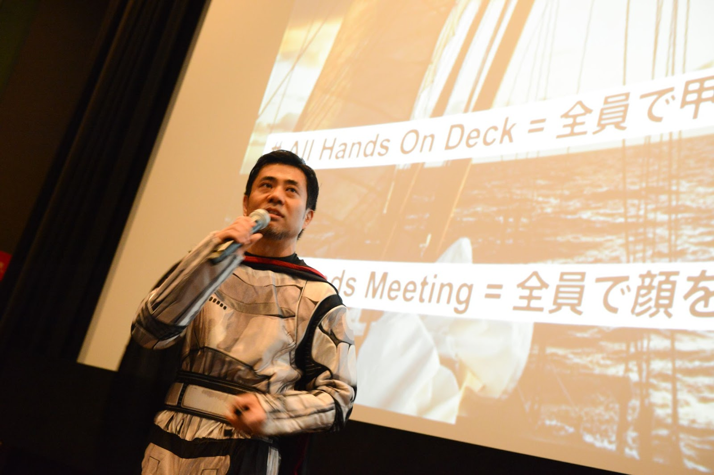 弊社代表取締役社長兼CEOの長谷川(Shin)は、映画館にちなんでスターウォーズのコスチュームで登場!