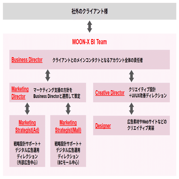 アカウント全体の責任者である我々のようなBusiness Directorを中心に、プロモーション戦略を設計するMarketing DirectorやMarketing Strategistが広告運用の方針を取りまとめ、外部パートナーとのディレクションも担います。