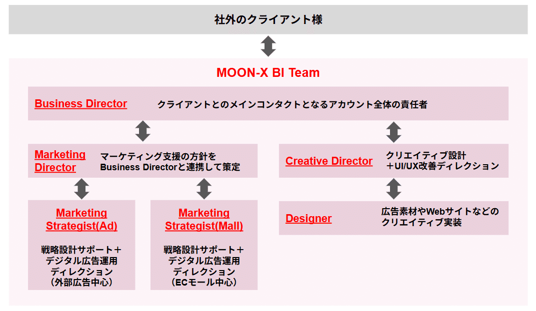 アカウント全体の責任者であるBusiness Directorを中心に、プロモーション戦略を設計するMarketing DirectorやMarketing Strategistが広告運用の方針を取りまとめ、外部パートナーとのディレクションも担います。