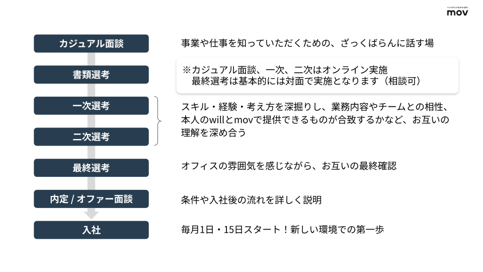 こんにちは!mov HRの成田です。この記事では、movの選考フローについて詳しく解説します。選考の流れやポイントを事前に知ることで、安心して選考に進んでもらえたら嬉しいです。