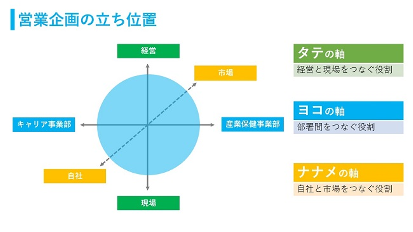 営業企画は、「事業の維持」「事業の発展」という2つの目的に向けて、やるべきこと・できることを推進していく部署です。そのために大切なのが、事業が発展していく上で生じる事業と組織の課題を予測して解決することだと思います。あらゆる観点から事業と組織を捉え、事業が生み出す価値の最大化に貢献するのが営業企画の役割です。