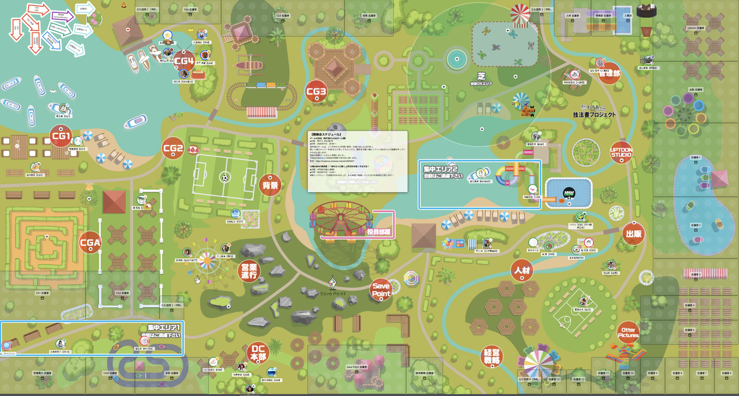 下記の写真のように、まるでゲームのマップのようなバーチャルオフィス上に、部門ごとのエリアがありますので、そこに各自ログインをして毎日の業務にあたっています。