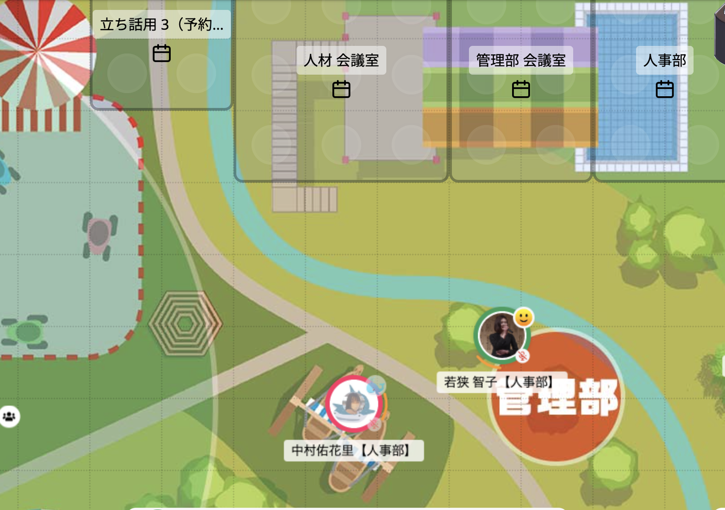 それぞれのアイコンが表示されますので、誰がどこにいるかわかりやすく、このアイコンを動かし、相手の会話可能な範囲に入ることで、バーチャルオフィス上で会話もできちゃいます!
