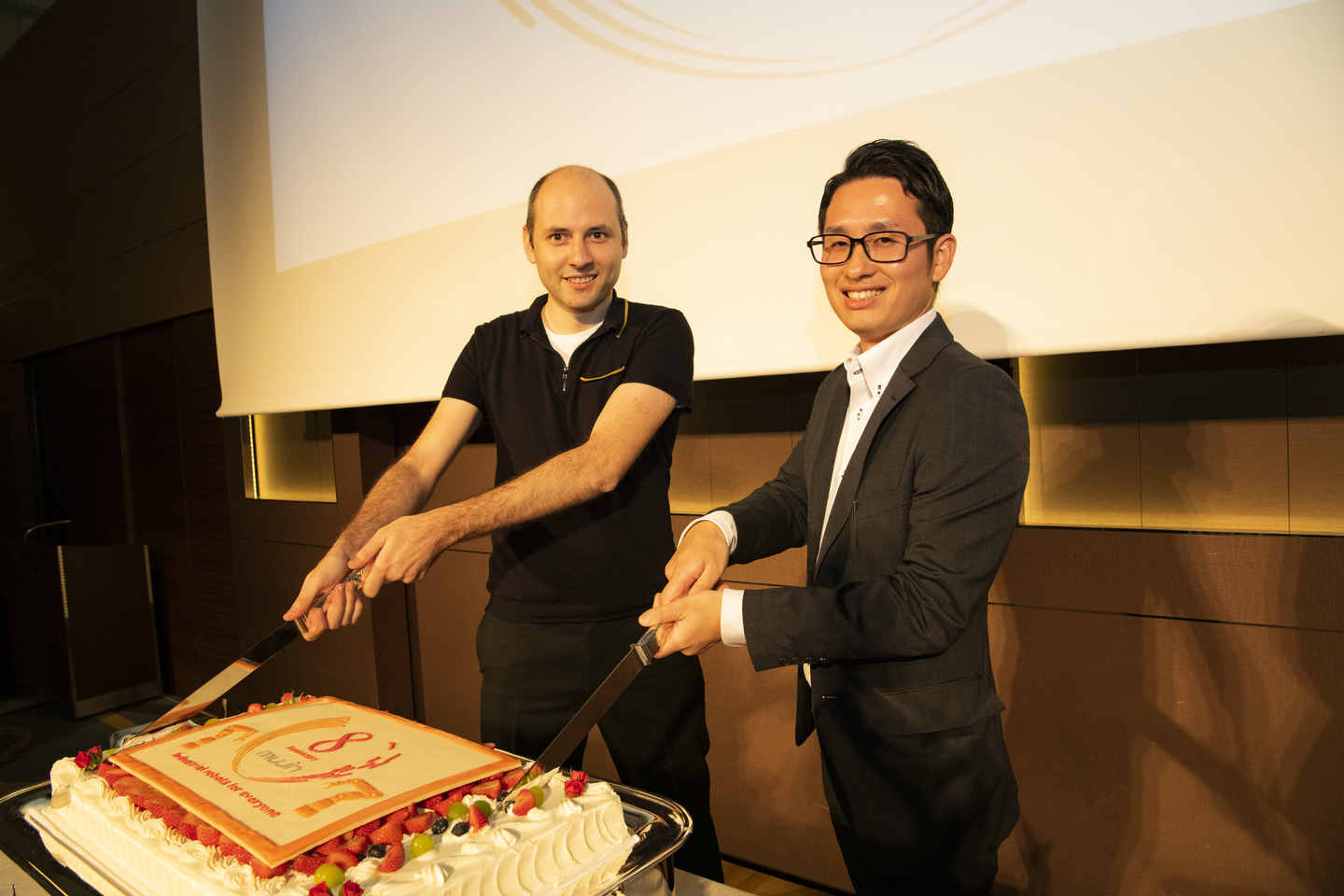 8周年を記念したケーキが登場し、CEO IsseiさんとCTO Rosenさんのケーキカット!