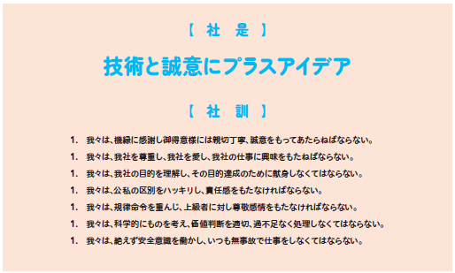 当社グループは経営理念に続き、経営上の方針を示した「社是」、すべての従業員が守るべき理念や心構えを示した「社訓」も設定しています。